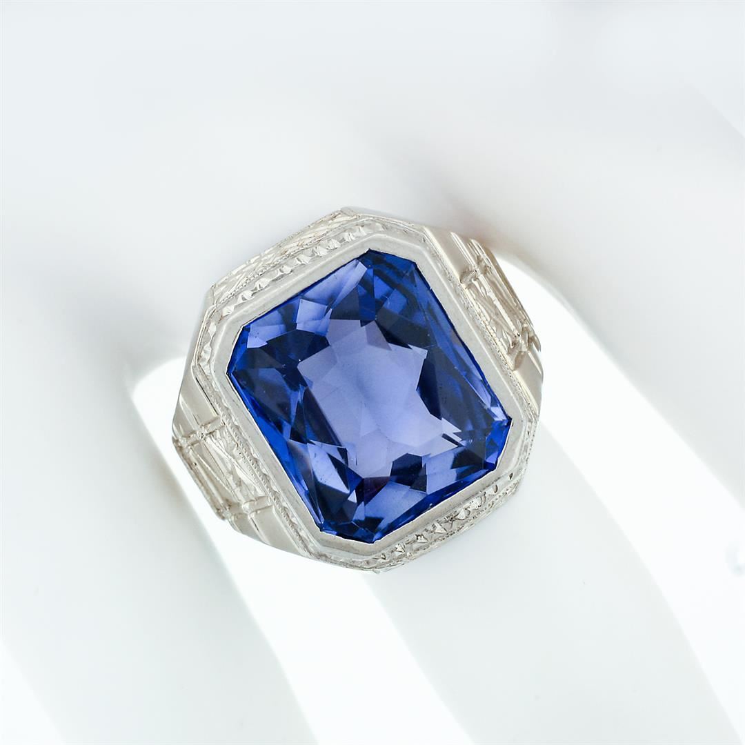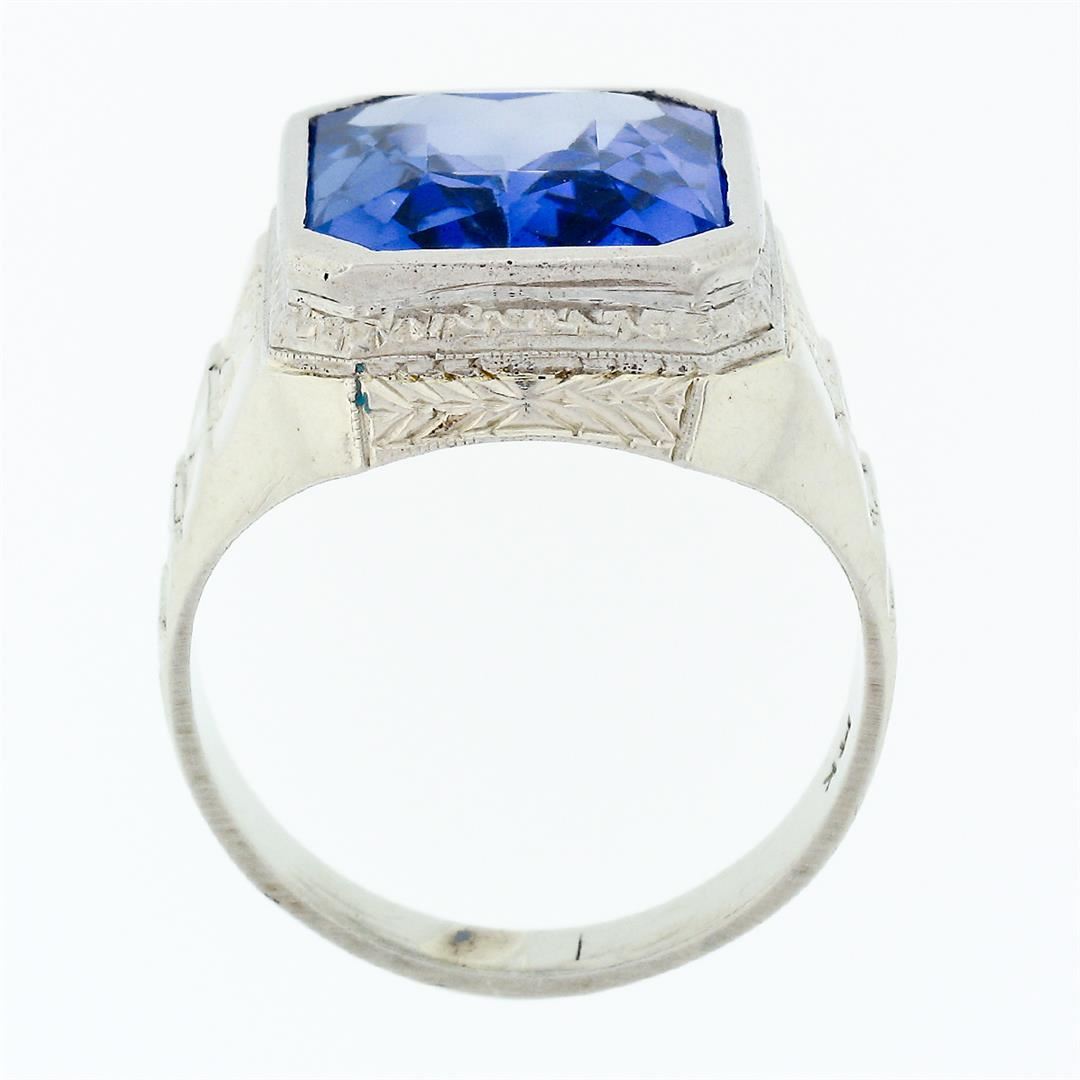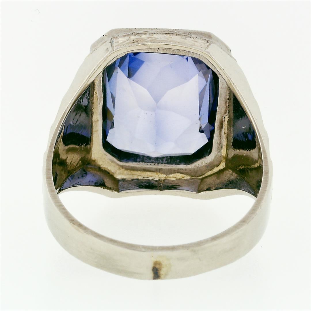 A solid 14k white gold ring, with 1 faceted cut cornered rectangular shape blue stone (14.5x12.5mm). The ring is size 10.0, weighs a total of 10.24 grams, and measures 19.5mm wide.
