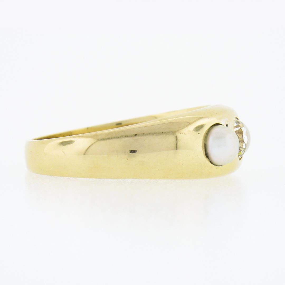 An antique solid 14k yellow gold ring, with 1 old european cut natural diamond (F - VS1 ; 0.28ctw), and 2 round shape cultured pearls (3.9mm each). The ring is size 7.0, weighs a total of 5.19 grams, and measures 7mm wide.