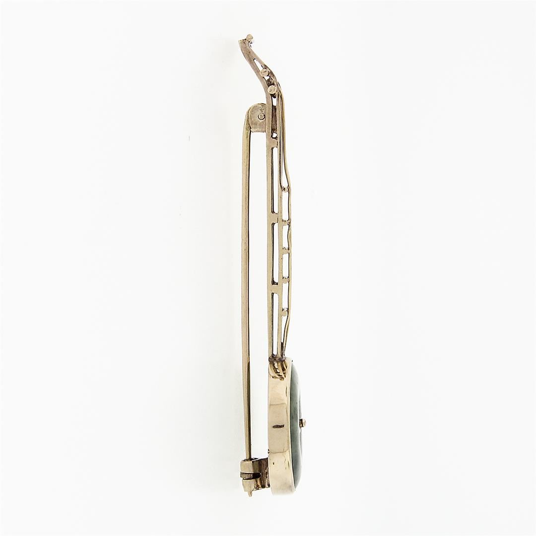 An antique solid 14k yellow gold banjo pin brooch, with 1 circular domed shape natural jade (16.3mm). Measures 55.85x17mm and weighs a total of 4.73 grams.
