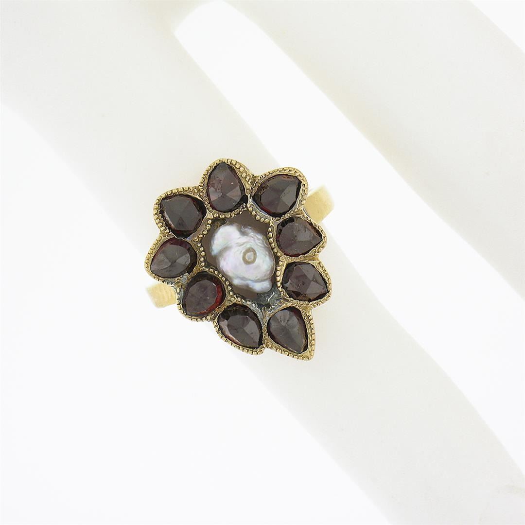 An antique solid 14k yellow gold ring, with baroque shaoe cultured pearl (1.80ctw), surrounded with a halo of 9 old rose cut natural garnets (6.5x4.9mm ). The ring is size 3.5, weighs a total of 4.21 grams, and measures 17.65mm wide.