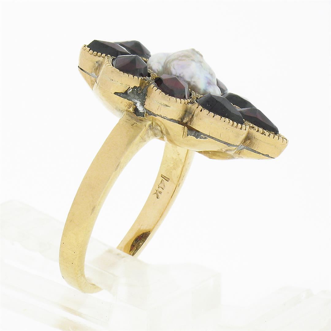 An antique solid 14k yellow gold ring, with baroque shaoe cultured pearl (1.80ctw), surrounded with a halo of 9 old rose cut natural garnets (6.5x4.9mm ). The ring is size 3.5, weighs a total of 4.21 grams, and measures 17.65mm wide.