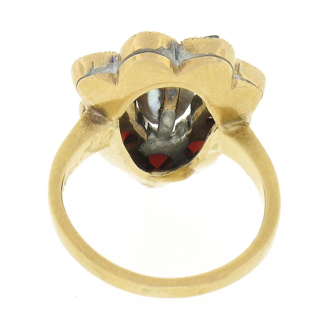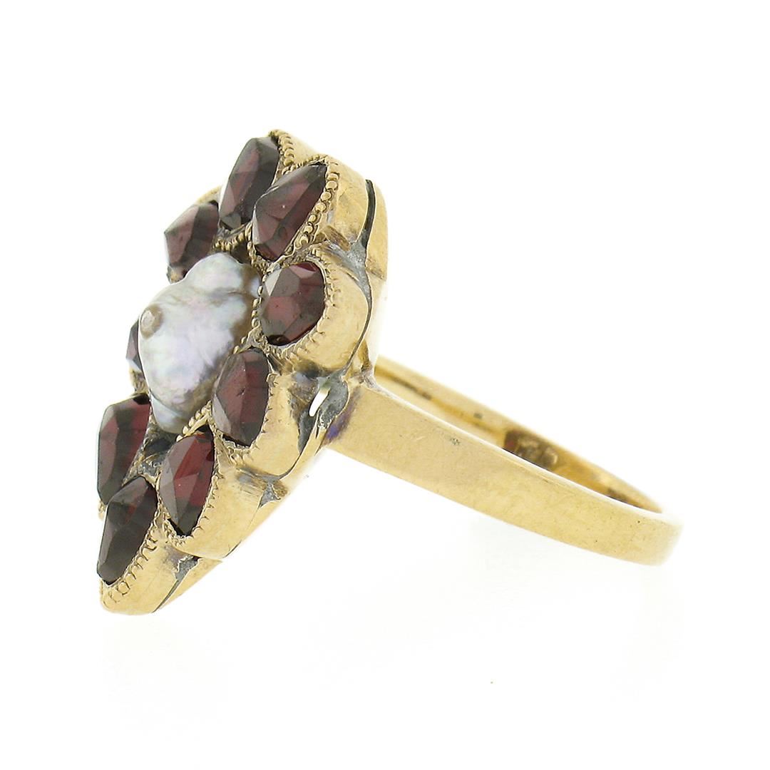 An antique solid 14k yellow gold ring, with baroque shaoe cultured pearl (1.80ctw), surrounded with a halo of 9 old rose cut natural garnets (6.5x4.9mm ). The ring is size 3.5, weighs a total of 4.21 grams, and measures 17.65mm wide.