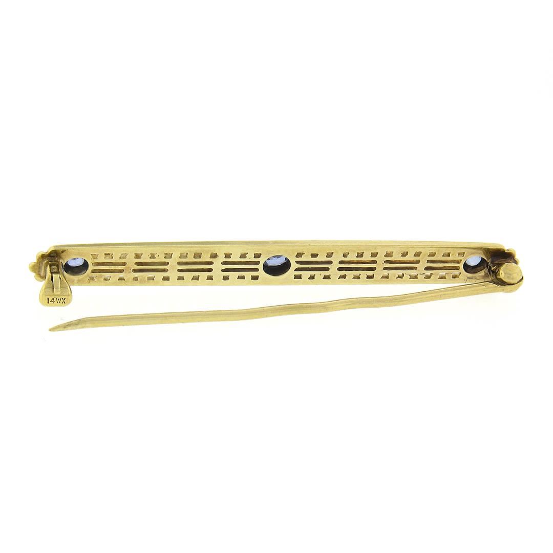 An antique solid 14k yellow gold bar brooch, with 6 round shape cultured seed pearls (1.8-2.0mm each), and 3 old round cut natural sapphires (0.25ctw). Measures 49.50x5.4mm and weighs a total of 3.48 grams.