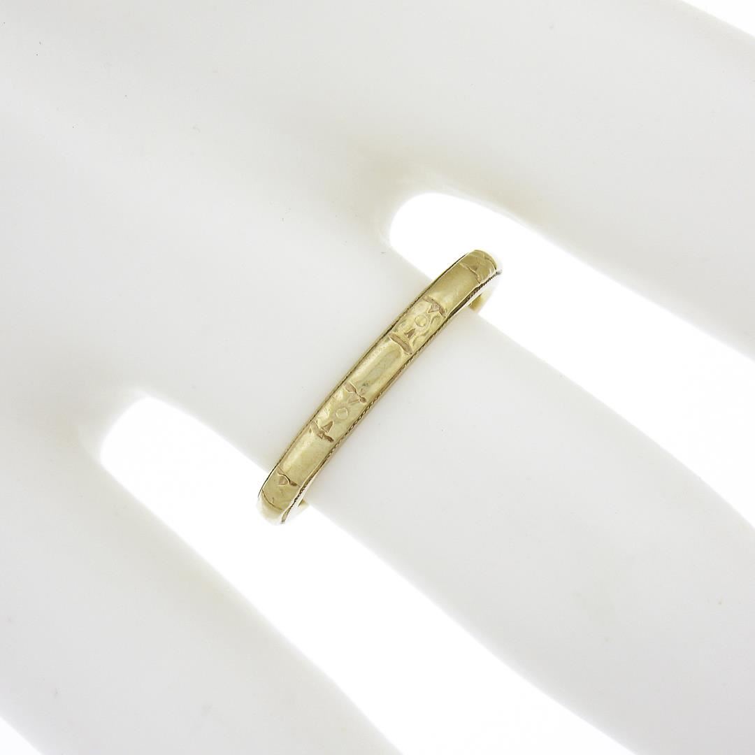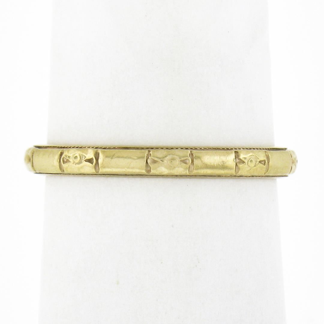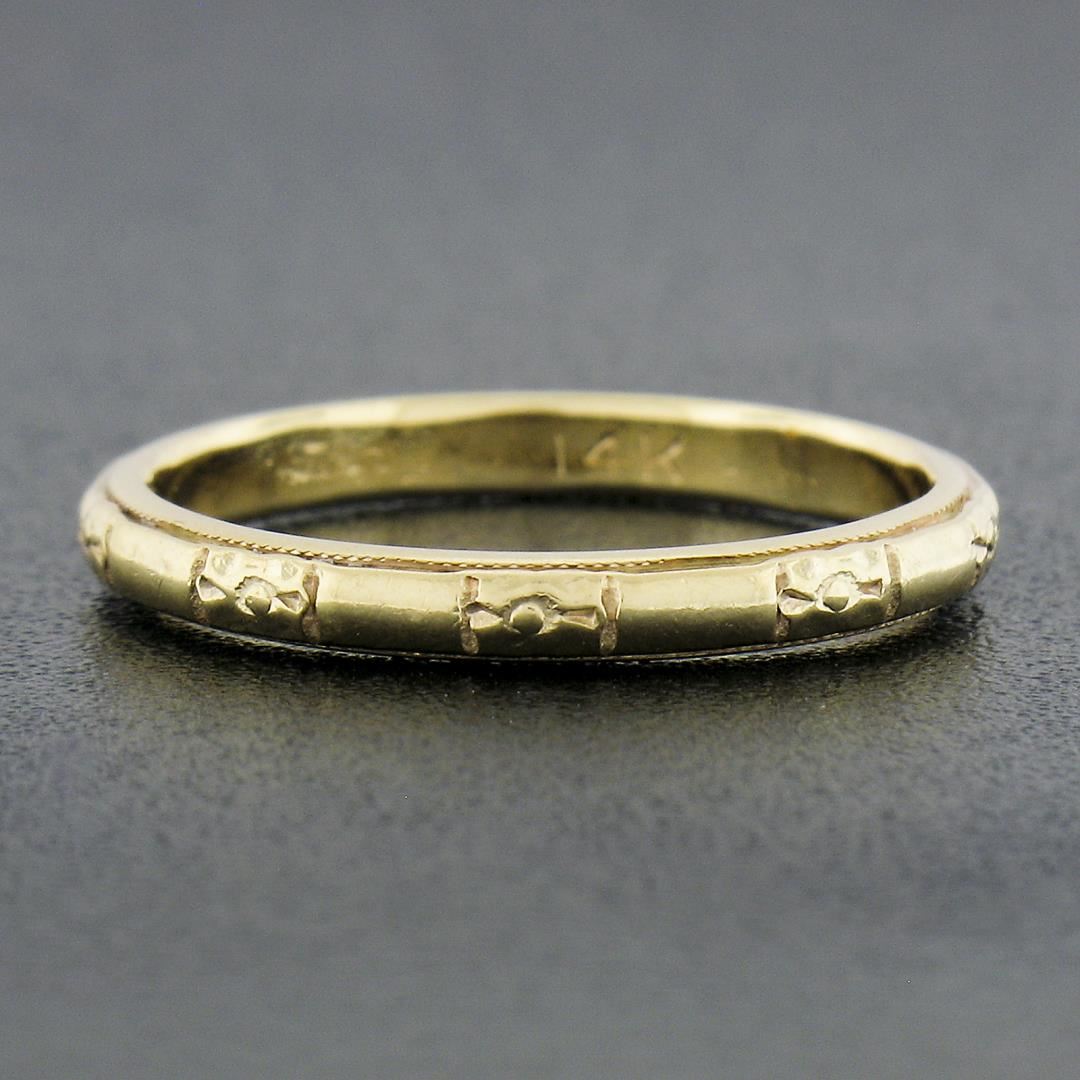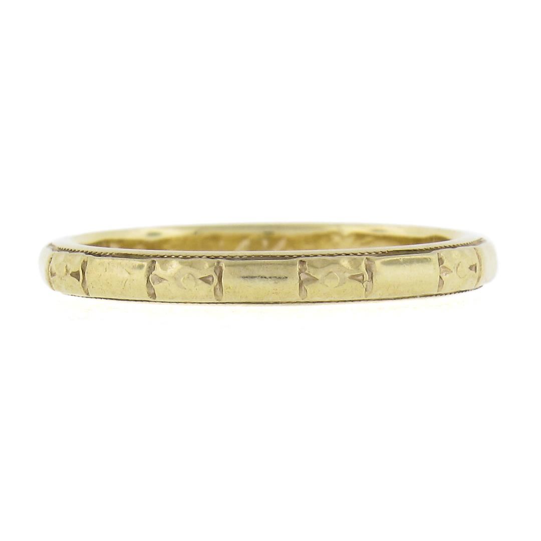 An antique solid 14k yellow gold stack band ring. The ring is size 5.0, weighs a total of 1.79 grams, and measures 2.1mm wide.