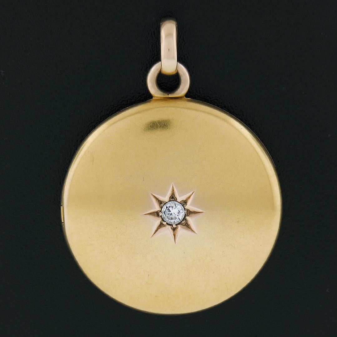 an antique solid 14k yellow gold locket pendant. with 1 old transitional cut natural diamond (H - SI1; 0.09ct). The pendant weighs a total of 8.05 grams, measures 37.80x27.80mm including the bail, and the inside of the bail measures 3.6x3.0mm. Inside Compartment Dimension 22.10mm .