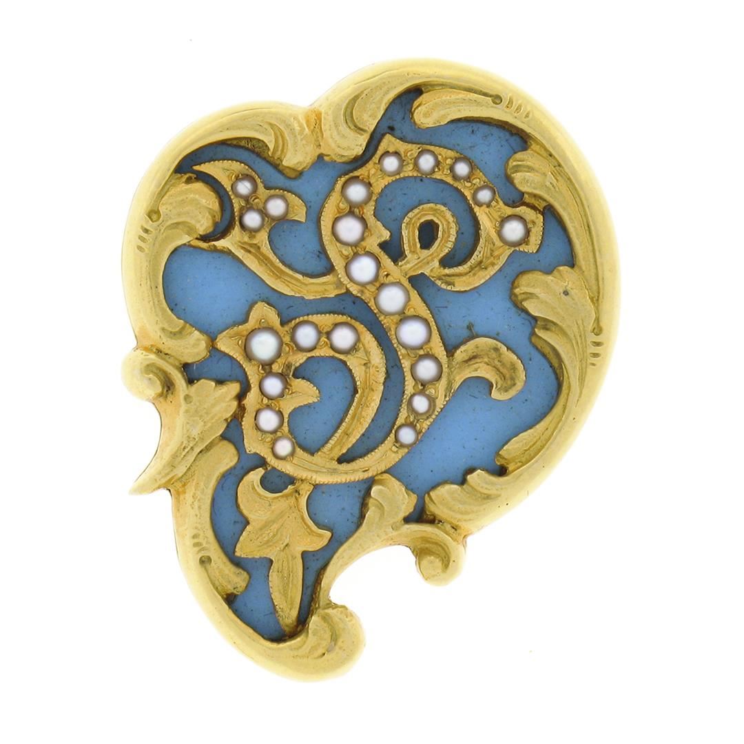 An antique solid 14k yellow gold brooch pendant. with unique shape natural turquoise, and 22 round shape seed pearls (1.0mm to 1.8mm each). Measures 32.60x25.65mm and weighs a total of 9.36 grams.
