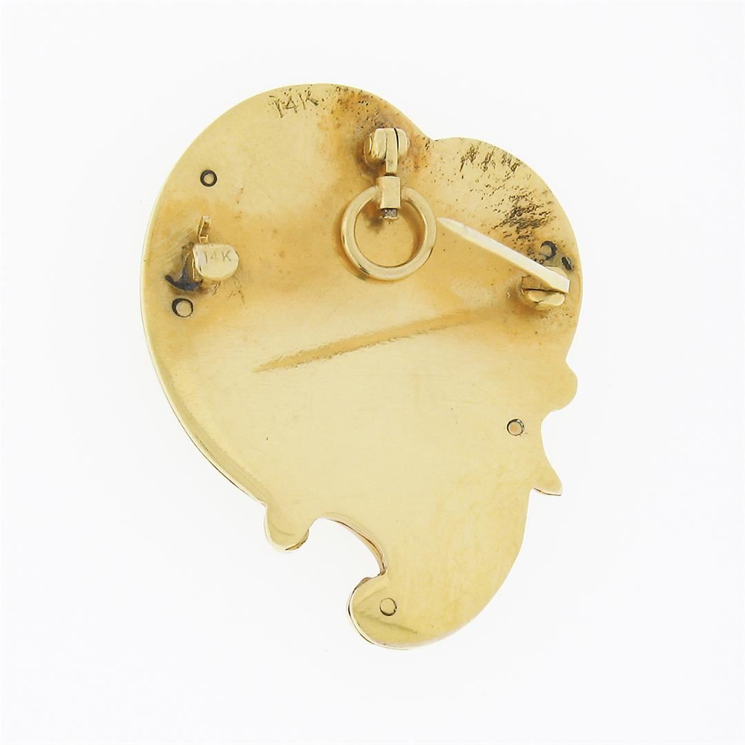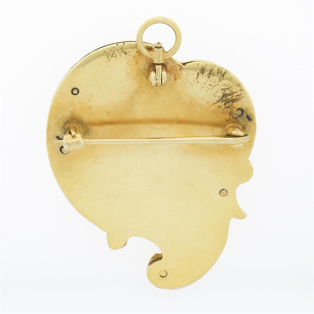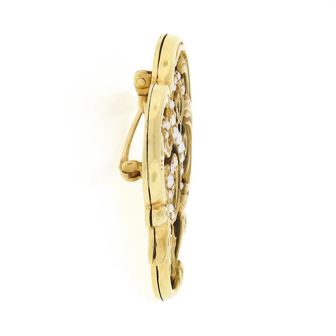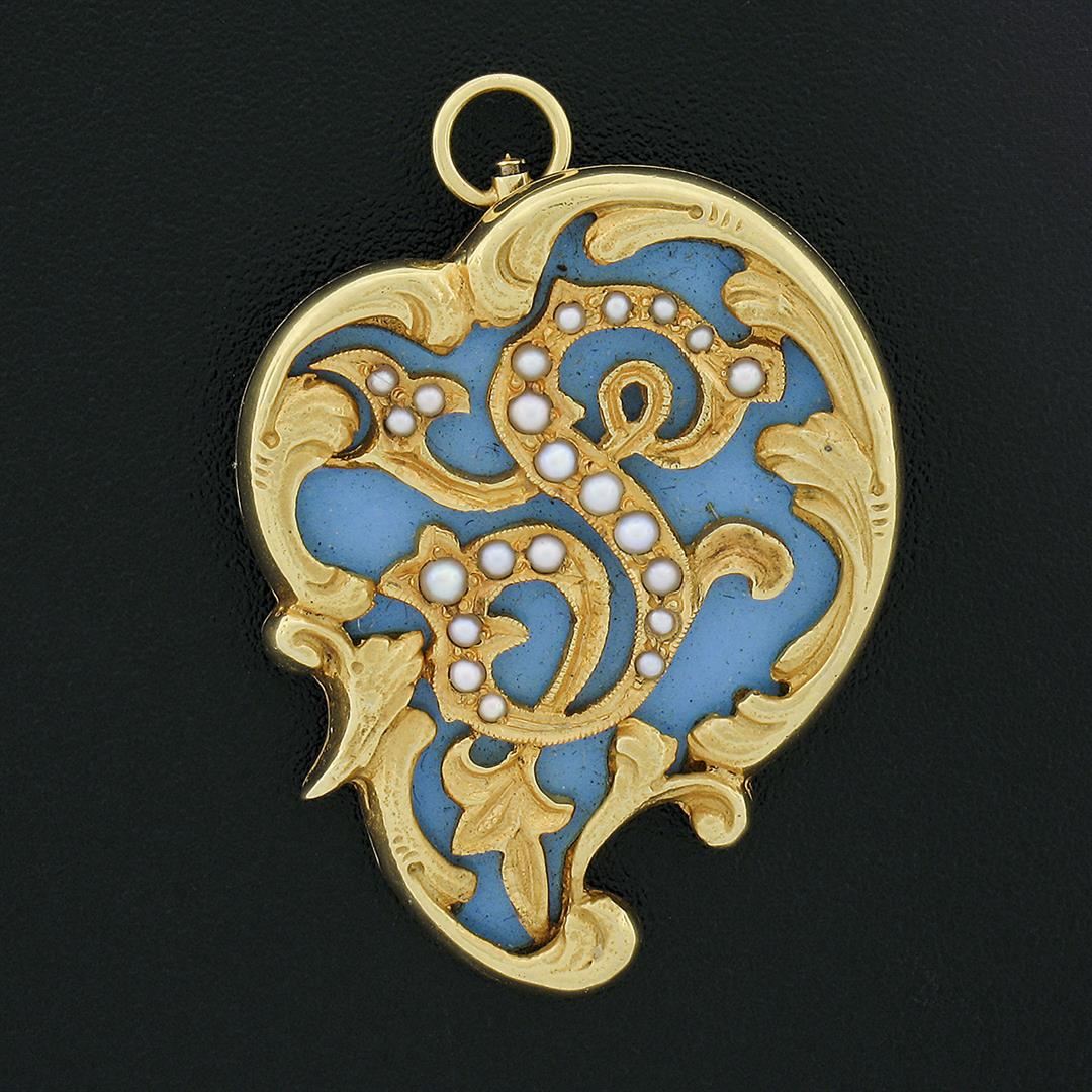 An antique solid 14k yellow gold brooch pendant. with unique shape natural turquoise, and 22 round shape seed pearls (1.0mm to 1.8mm each). Measures 32.60x25.65mm and weighs a total of 9.36 grams.