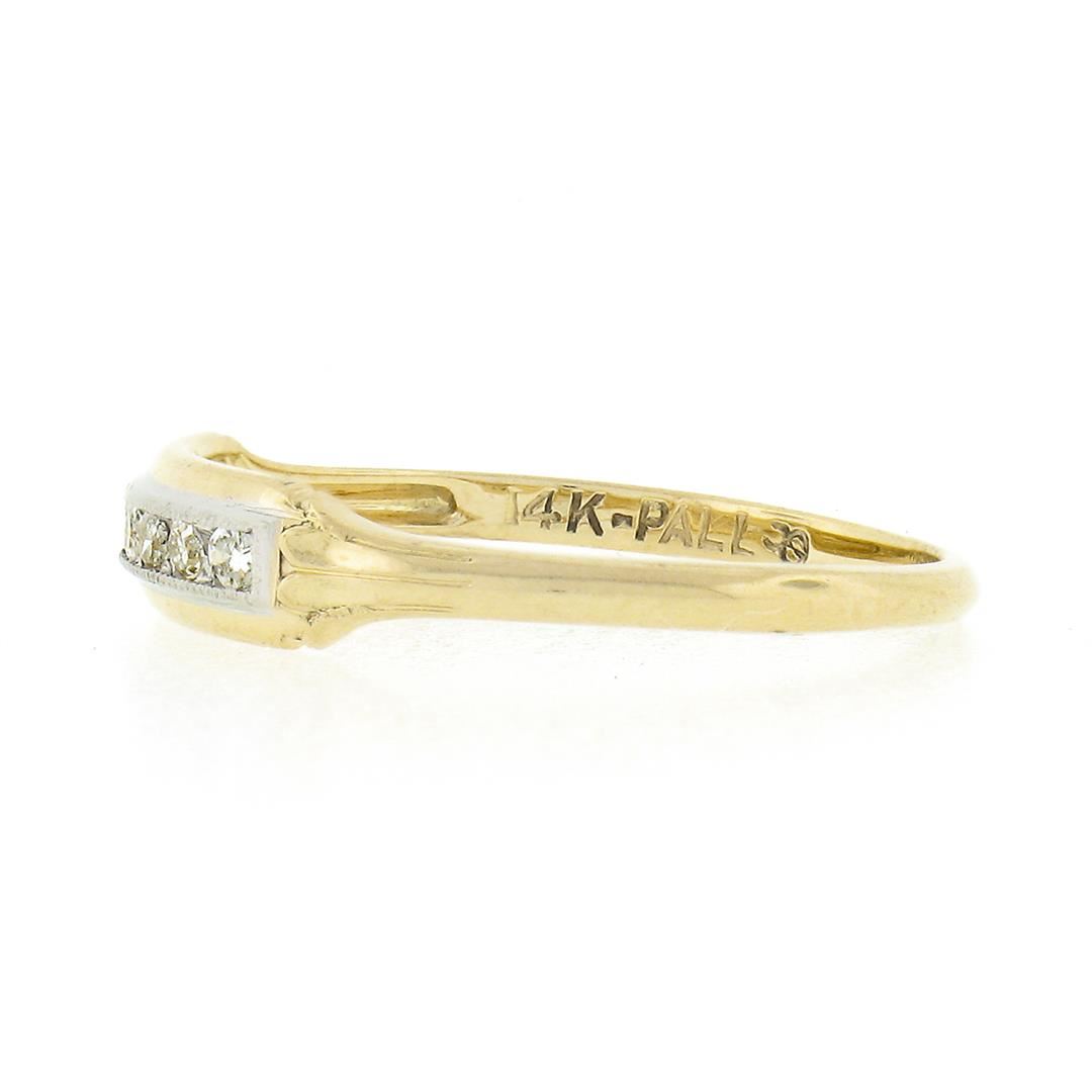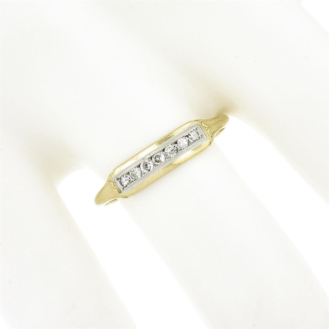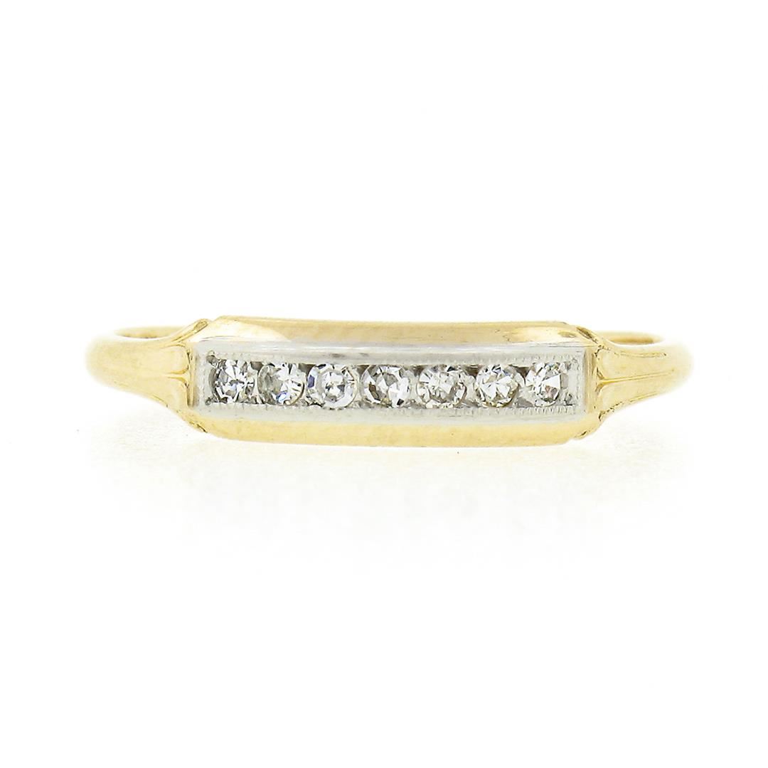 An antique solid 14k yellow gold and palladium band ring, with 7 single cut natural diamonds (G/H - VS2/SI1 ; 0.12ctw). The ring is size 7.0, weighs a total of 1.25 grams, and measures 3.90mm wide.