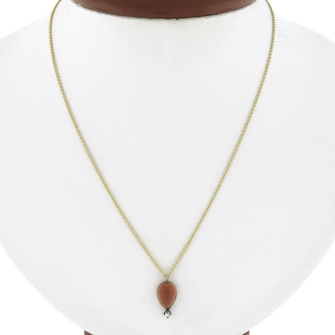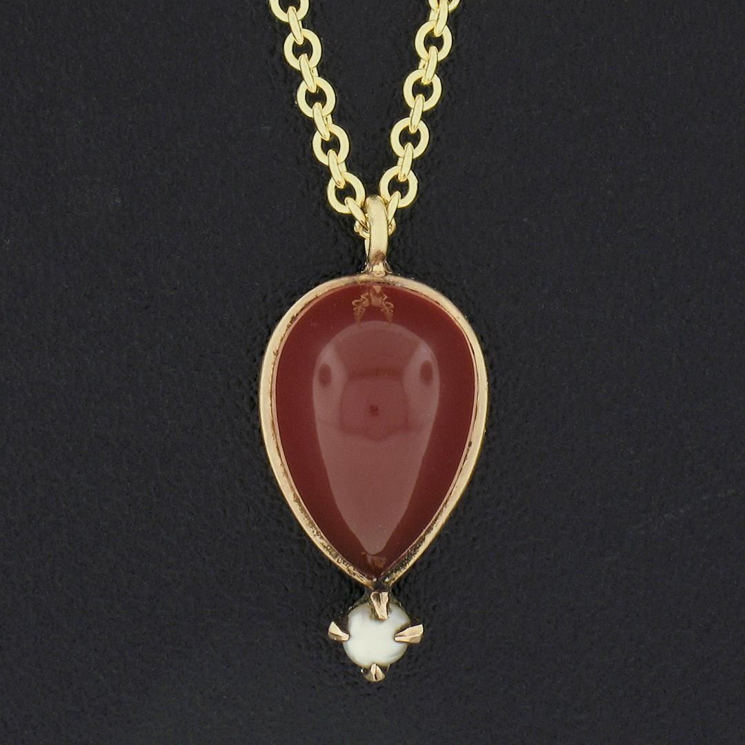 an antique solid 14k yellow gold pendant necklace, with 1 pear cabochon cut natural carnelian (10x6.9mm), and 1 round shape cultured seed pearl (2.25mm ). Adjustable 16 or 18 inch cable link chain, 3.24 grams total weight, pendant measures 16.15x7.7mm.