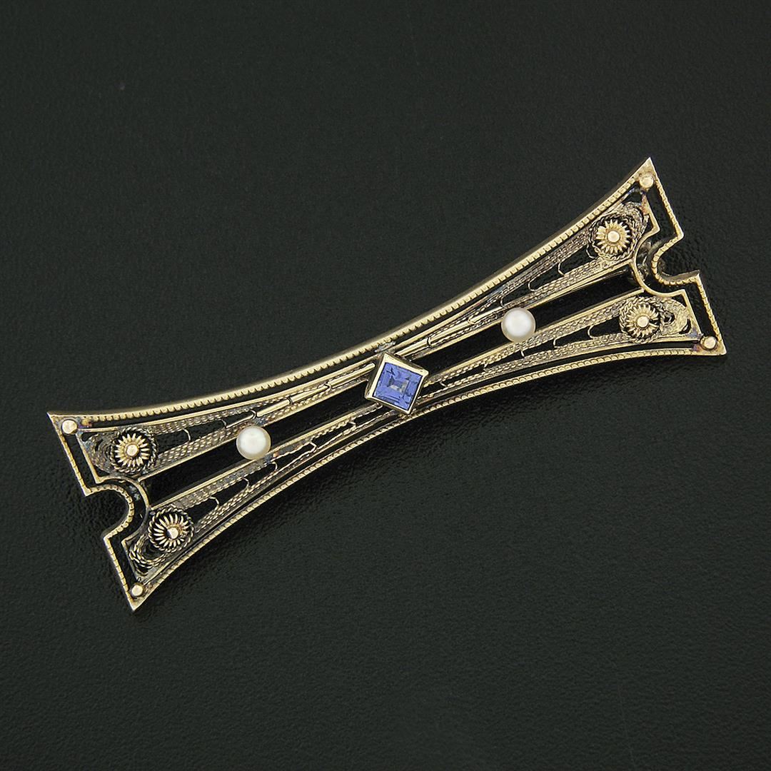 An antique solid 14k yellow gold bar pin brooch, with 1 square step cut natural montana sapphire (2.7mm), and 2 round shape cultured seed pearls (2.05mm). Measures 13.37x39.87mm and weighs a total of 2.68 grams.