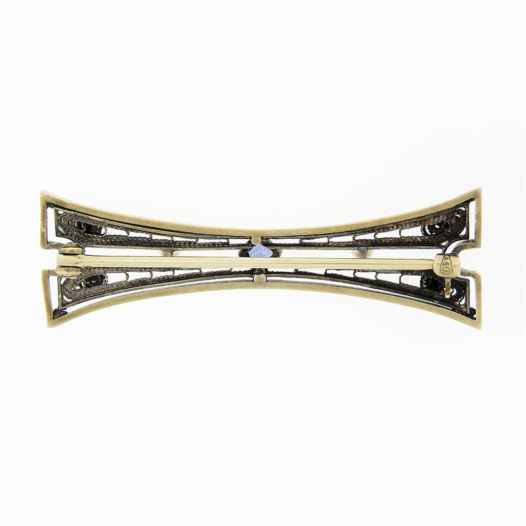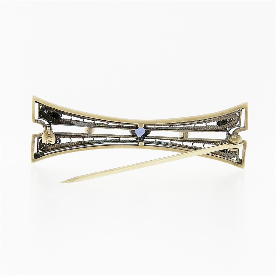 An antique solid 14k yellow gold bar pin brooch, with 1 square step cut natural montana sapphire (2.7mm), and 2 round shape cultured seed pearls (2.05mm). Measures 13.37x39.87mm and weighs a total of 2.68 grams.