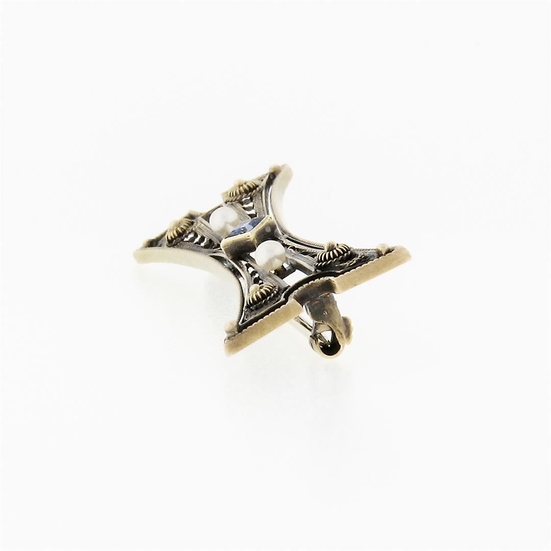An antique solid 14k yellow gold bar pin brooch, with 1 square step cut natural montana sapphire (2.7mm), and 2 round shape cultured seed pearls (2.05mm). Measures 13.37x39.87mm and weighs a total of 2.68 grams.