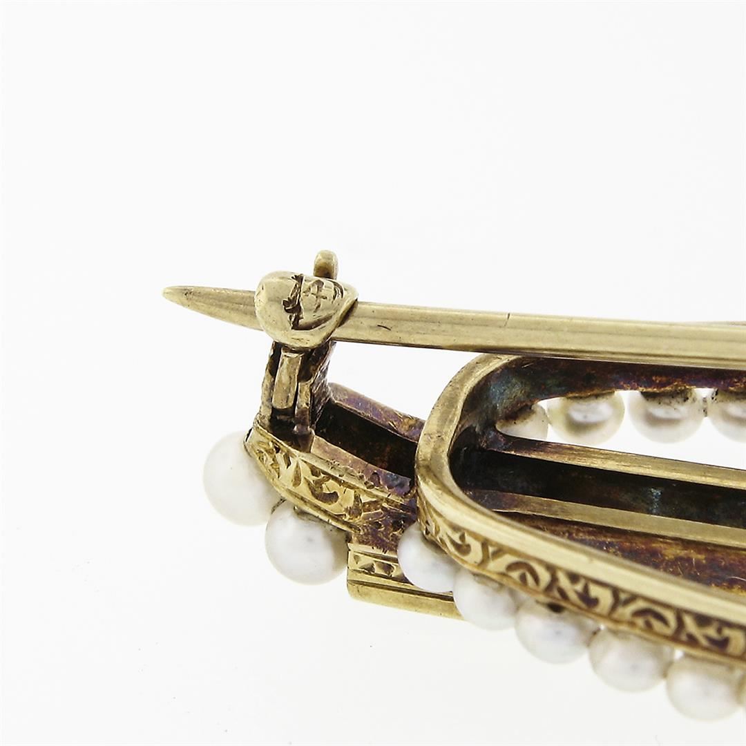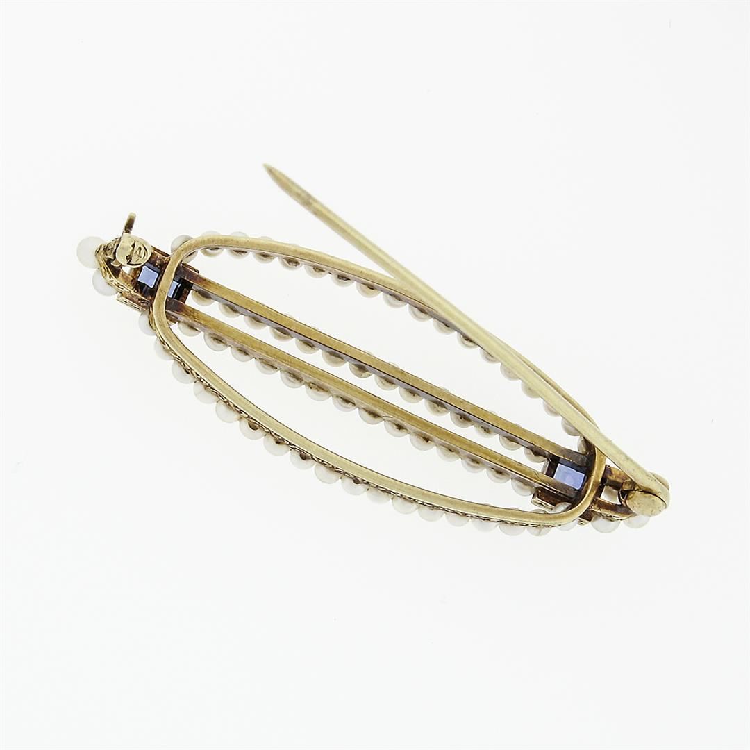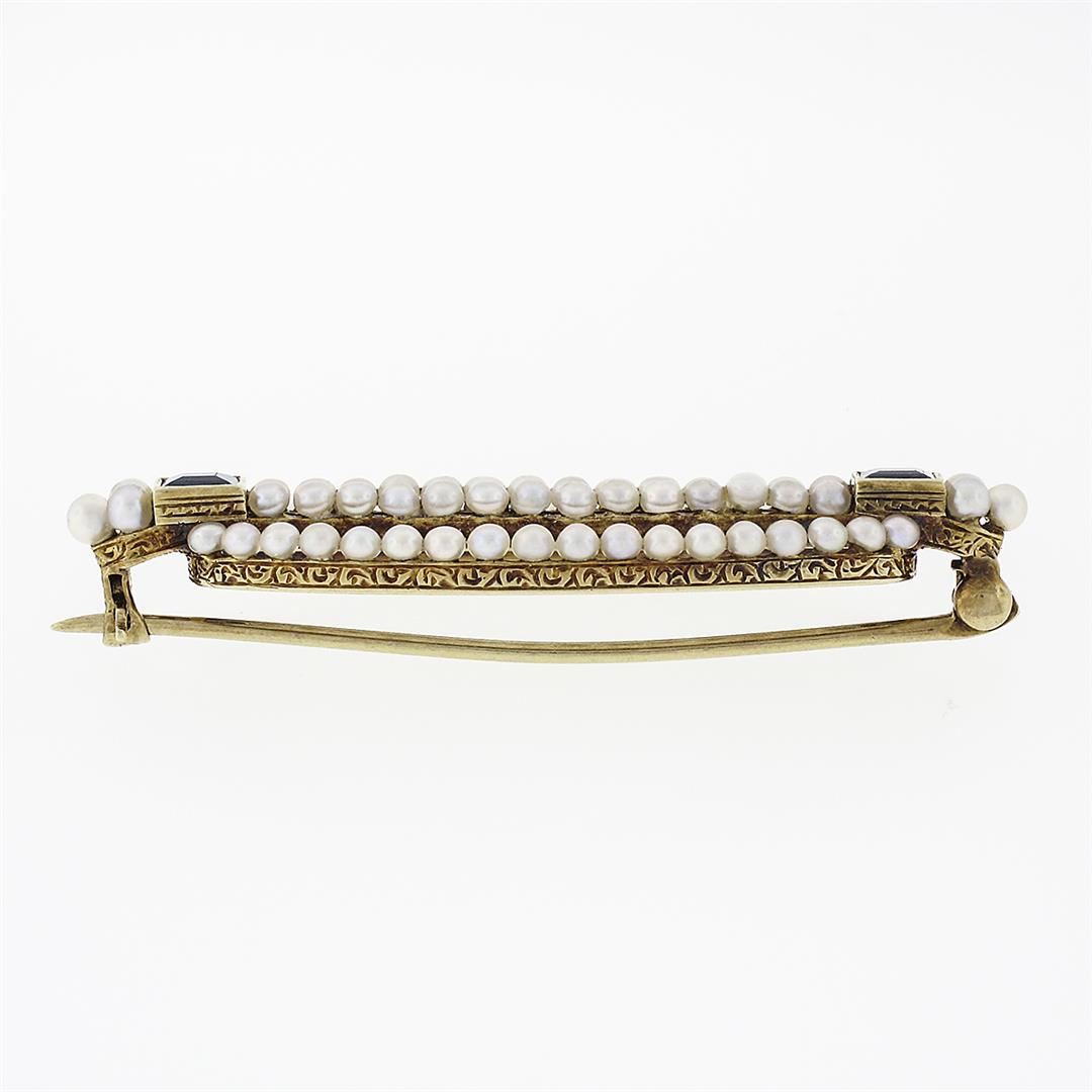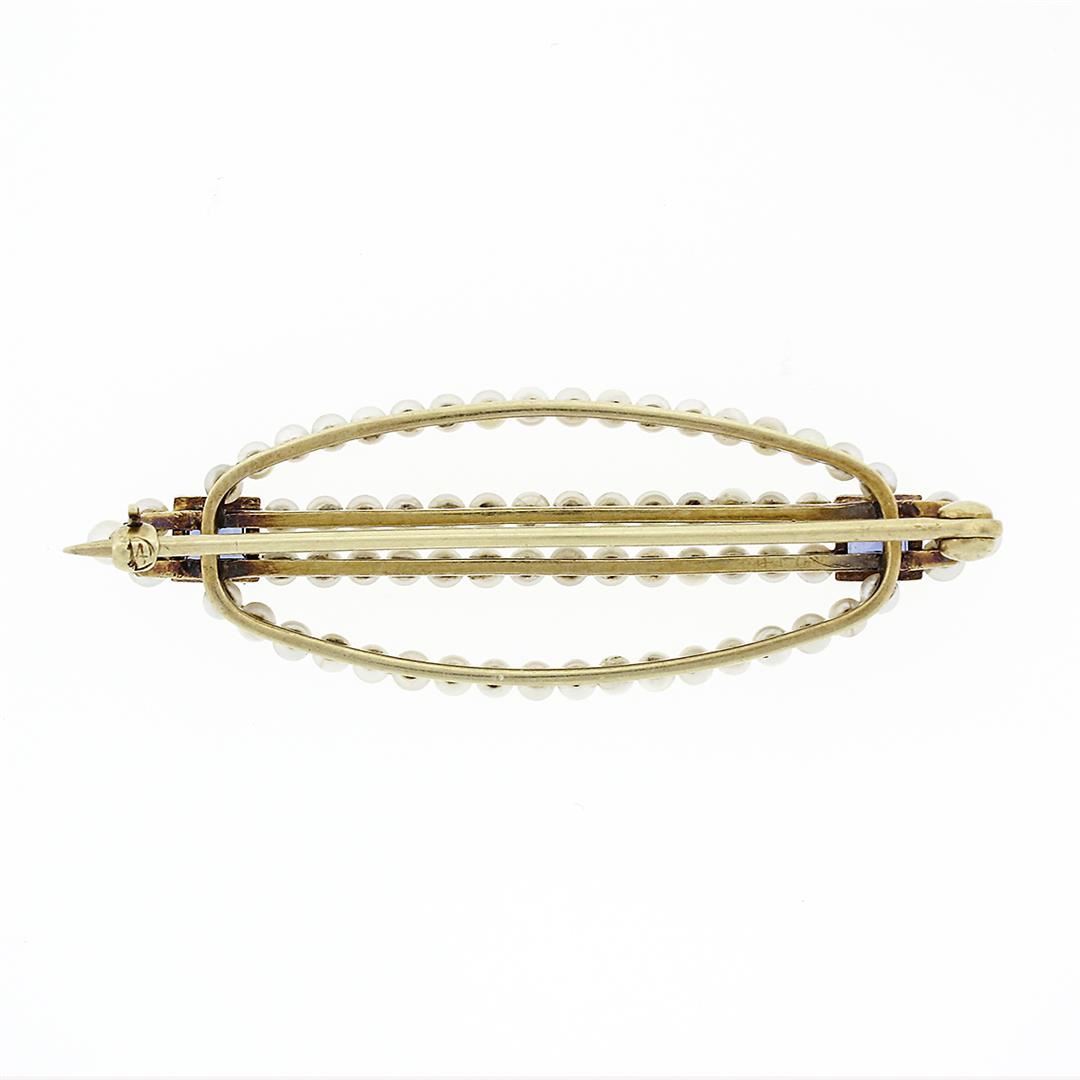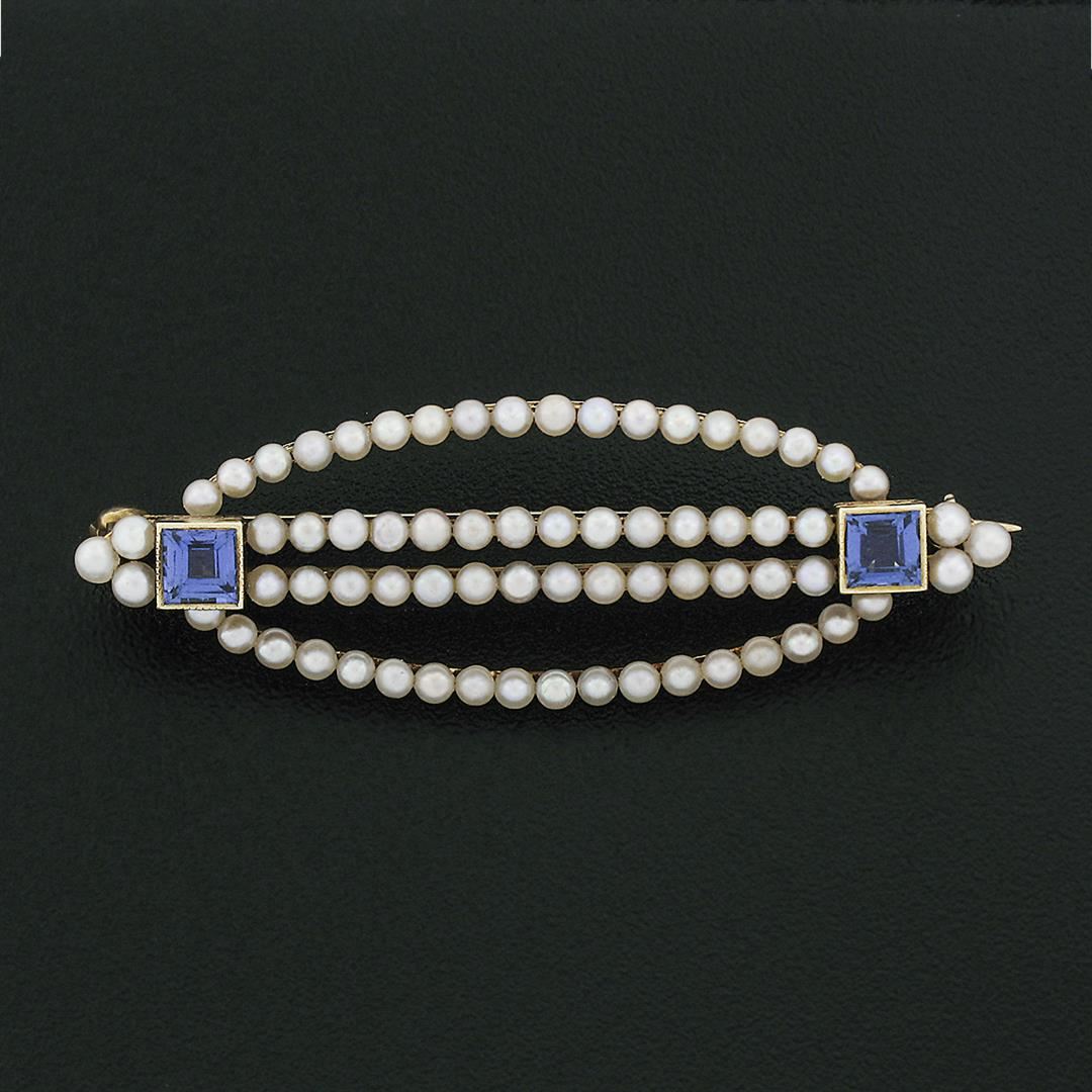 An antique solid 14k yellow gold pin brooch, with 2 square step cut natural montana sapphires (0.60ctw), and 70 round shape natural seed pearls (1.65mm). Measures 14.19x41.48mm and weighs a total of 3.98 grams.