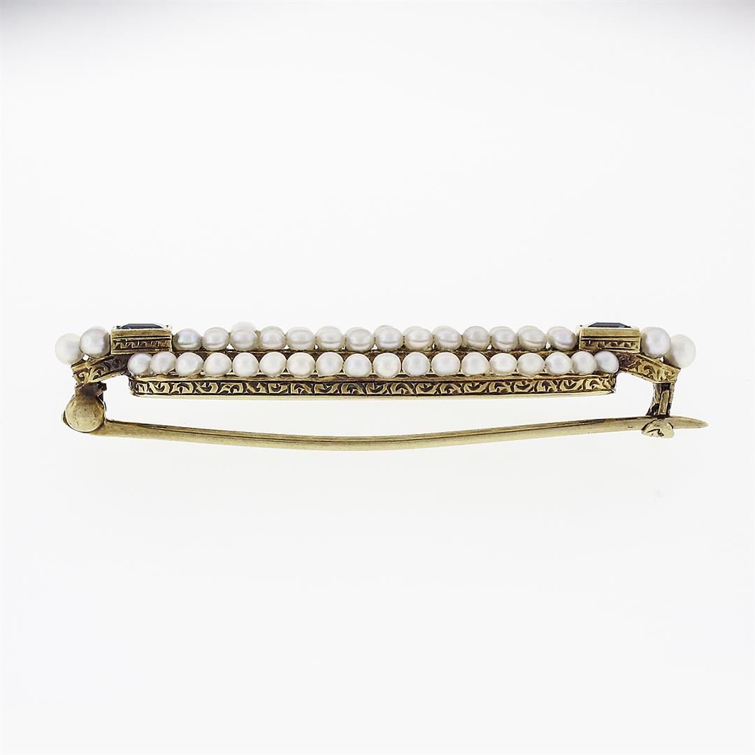 An antique solid 14k yellow gold pin brooch, with 2 square step cut natural montana sapphires (0.60ctw), and 70 round shape natural seed pearls (1.65mm). Measures 14.19x41.48mm and weighs a total of 3.98 grams.