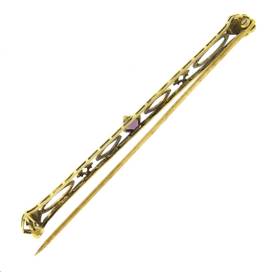 Antique 14k Yellow Gold Square Step Cut Amethyst Open Work Design Bar Pin Brooch