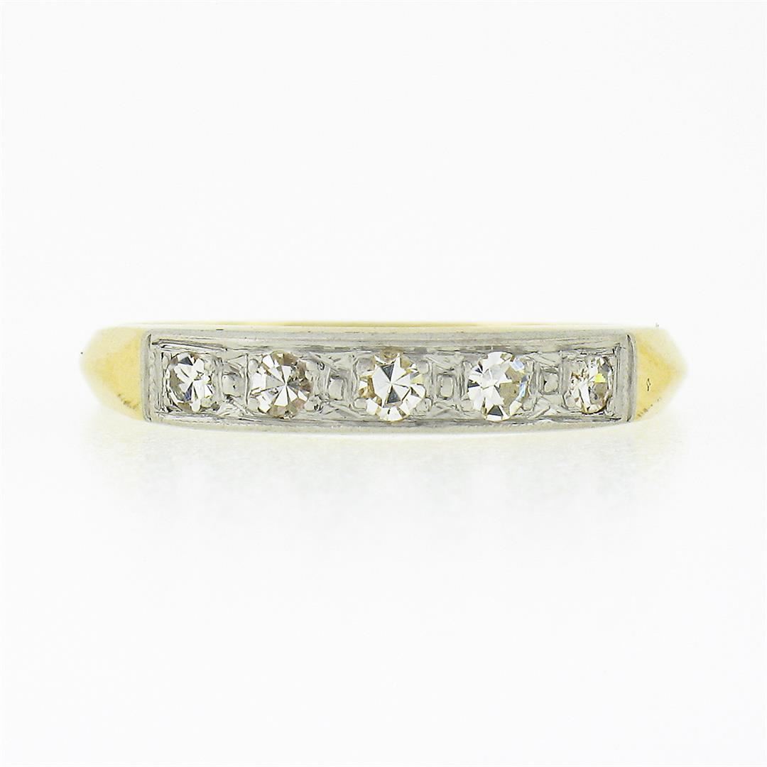 An antique slid 14k yellow gold and palladium band ring, with 5 old single cut natural diamonds (G/H - VS1/VS2 ; 0.20ctw). The ring is size 6.5, weighs a total of 1.80 grams, and measures 3.40mm wide.