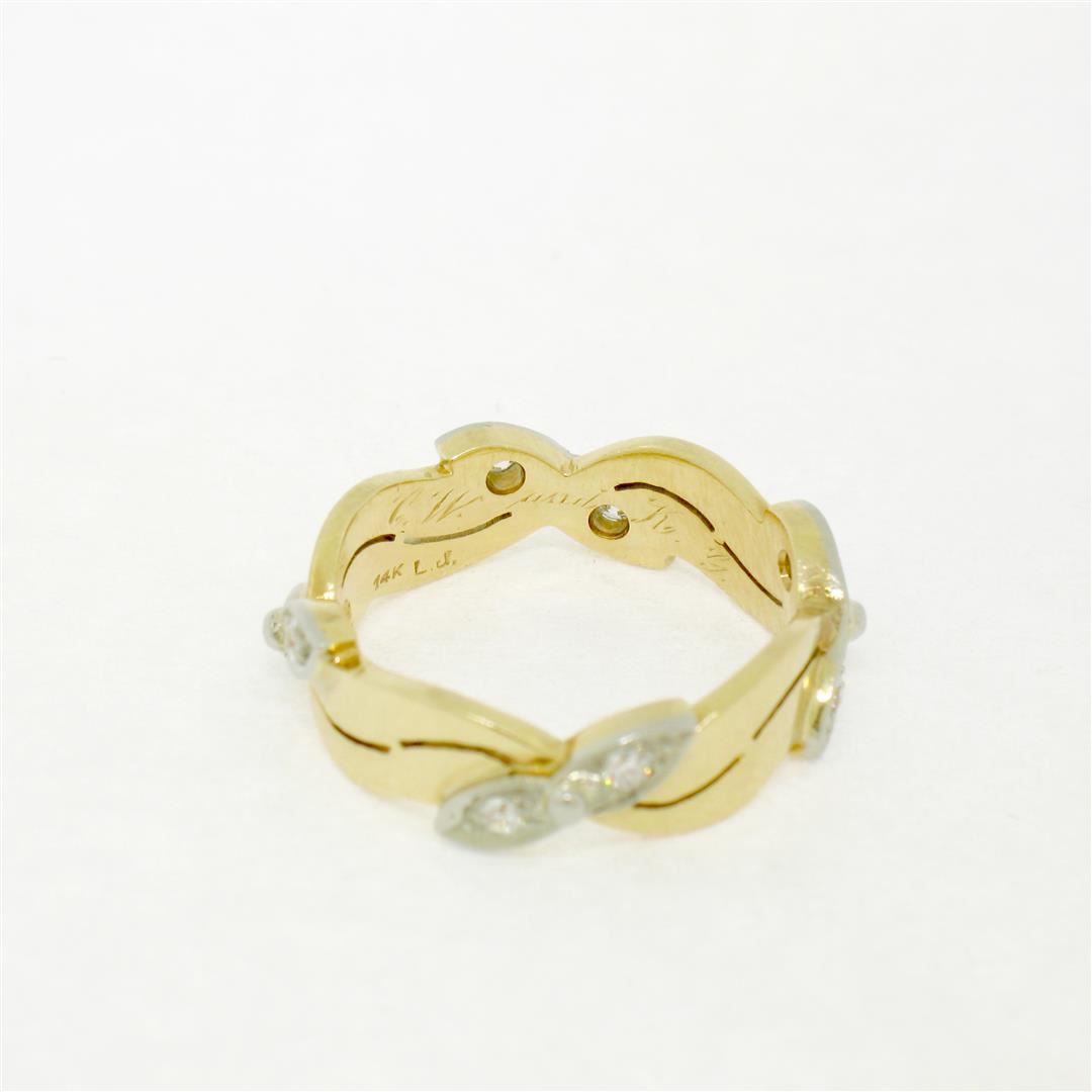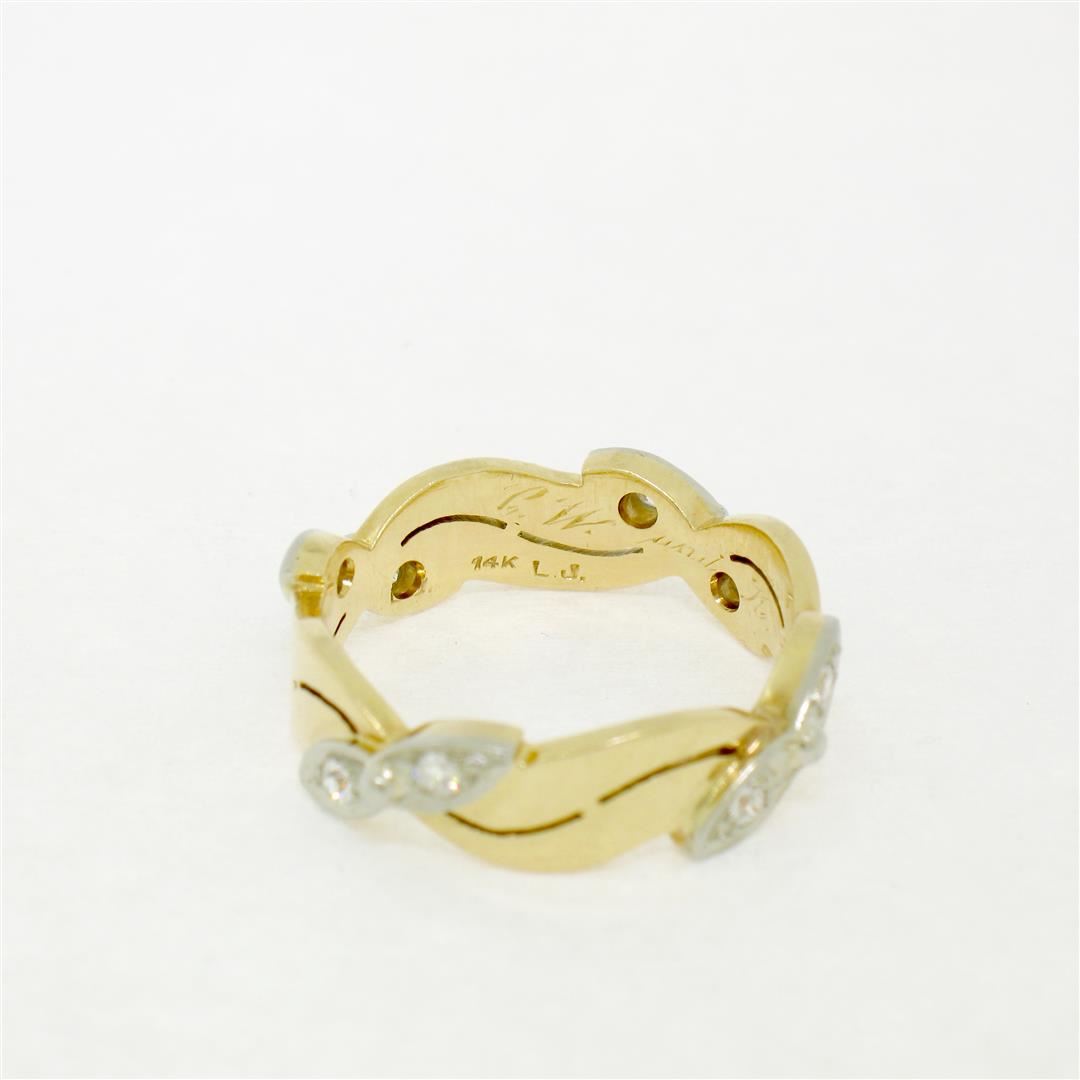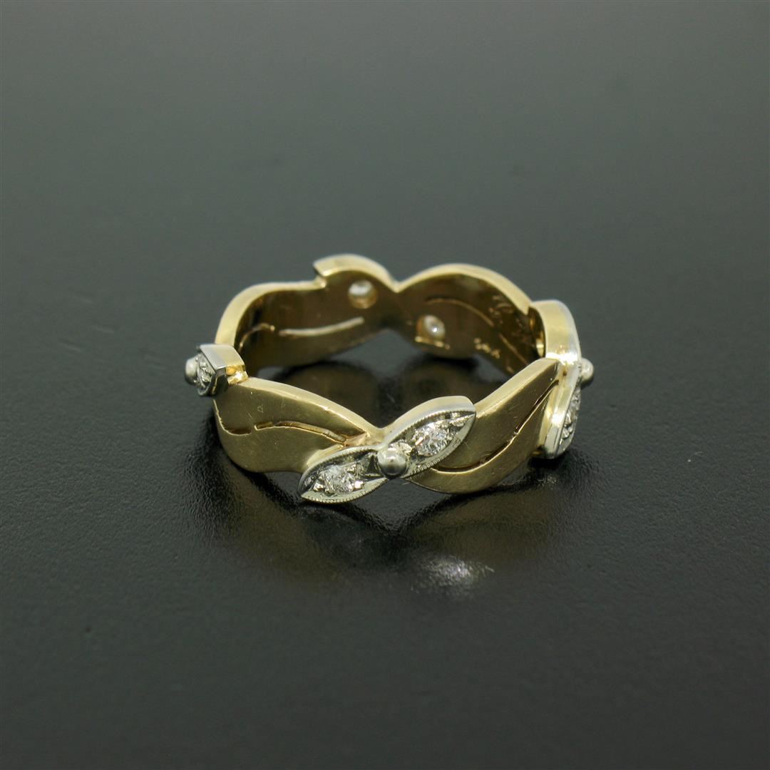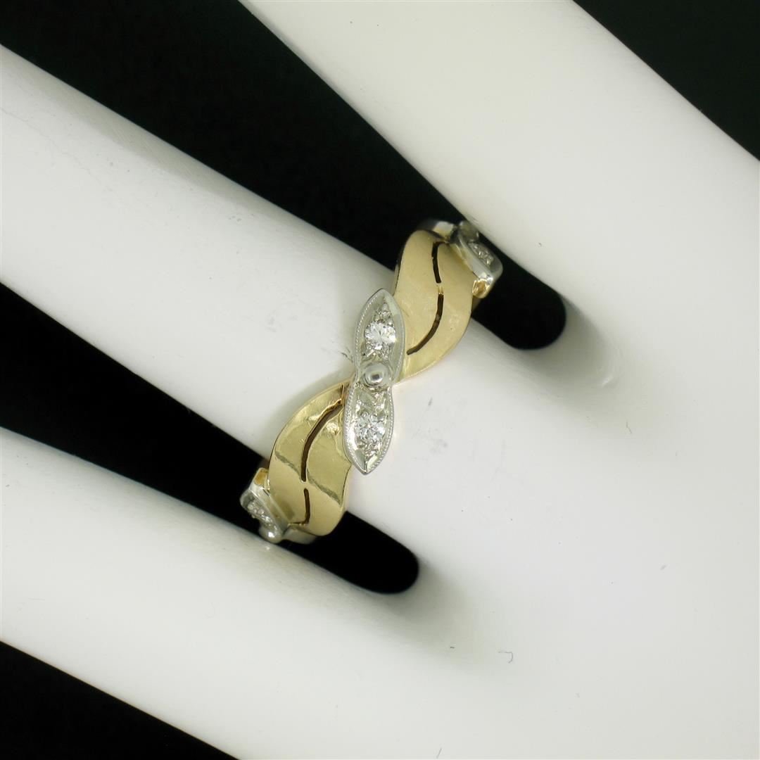 An excellent condition antique 14k gold ring featuring 0.28ctw of old European cut diamonds (F/G - VS1/VS2) set into white gold marquise shapes on a wavy yellow gold band. The ring is size 7, weighs a total of 4.82 grams, and measures 5.9mm wide.