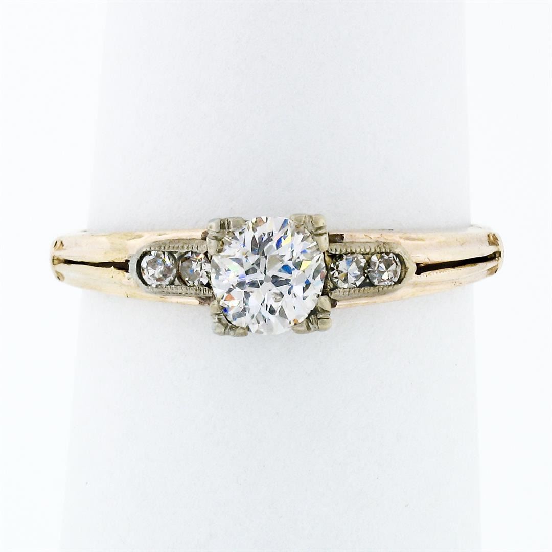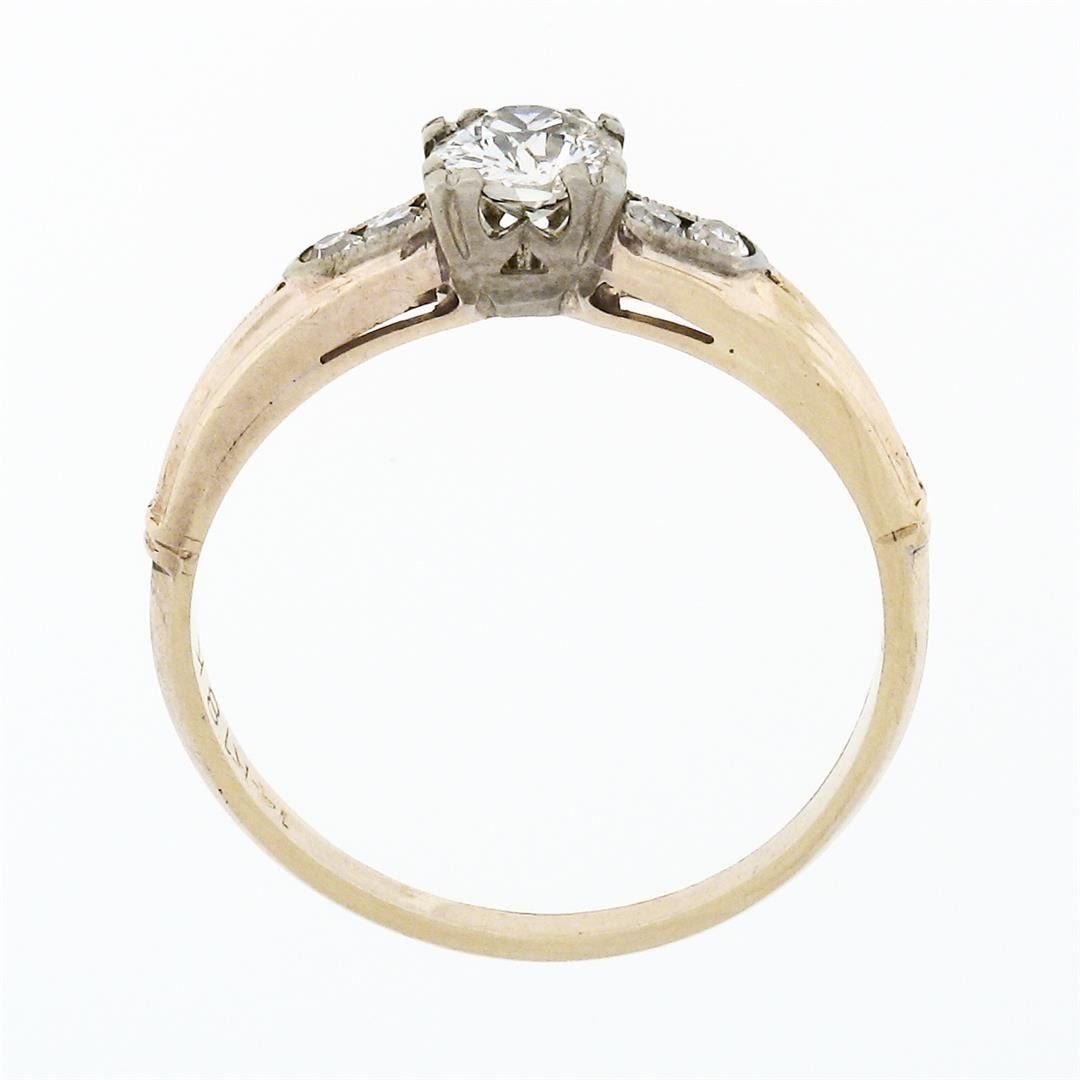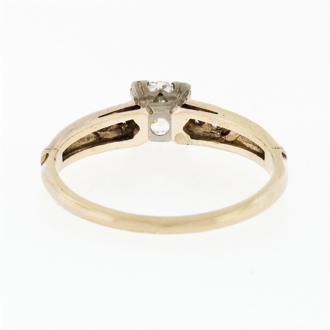 An antique solid 18k white gold & 14k yellow gold solitaire ring, featuring 1 old european cut natrual diamond (G - VS2; 0.42ct), and 4 old single cut natural diamonds (F/G - VS1/VS2 ; 0.08ctw). The ring is size 6, weighs a total of 1.65 grams, and measures 4.90mm wide.