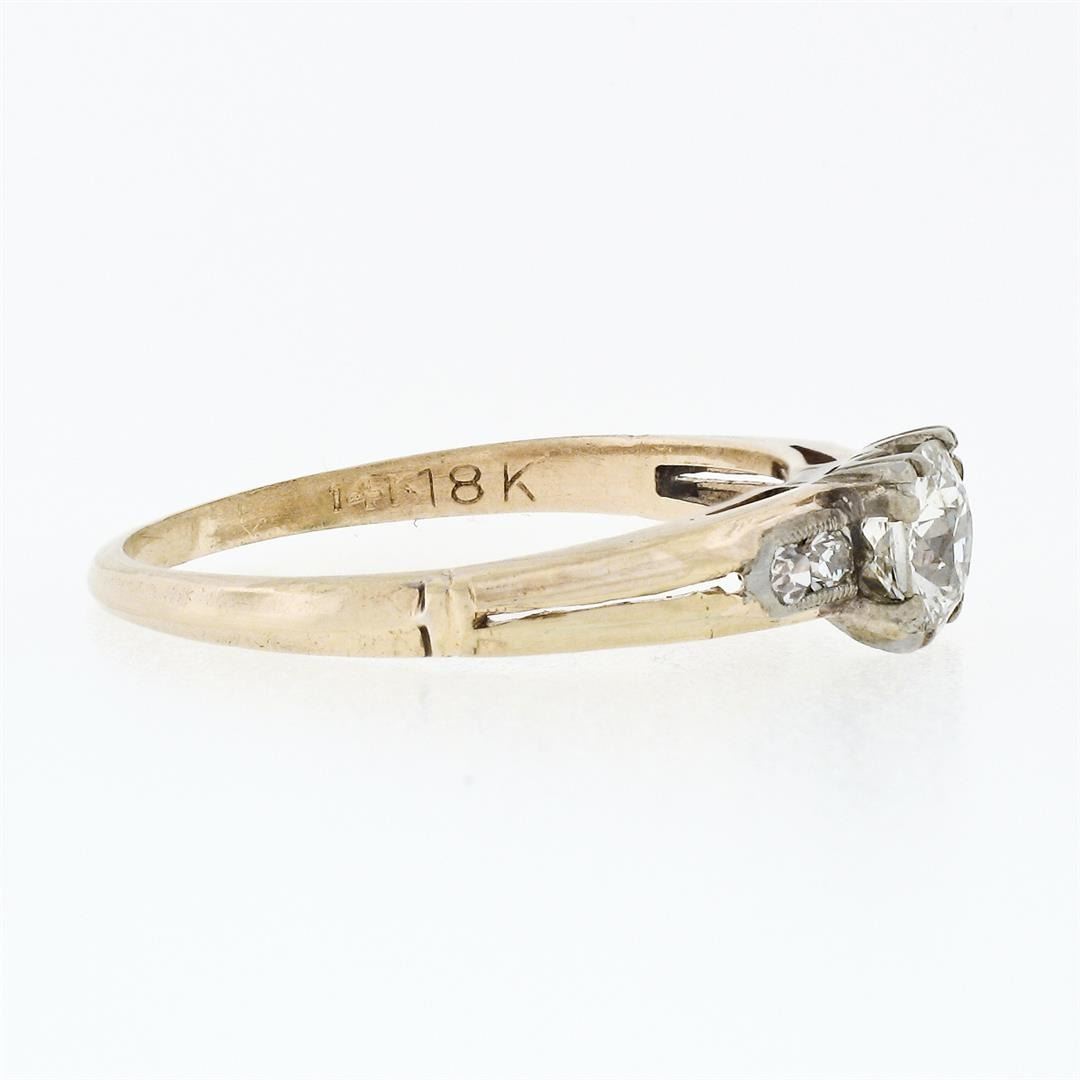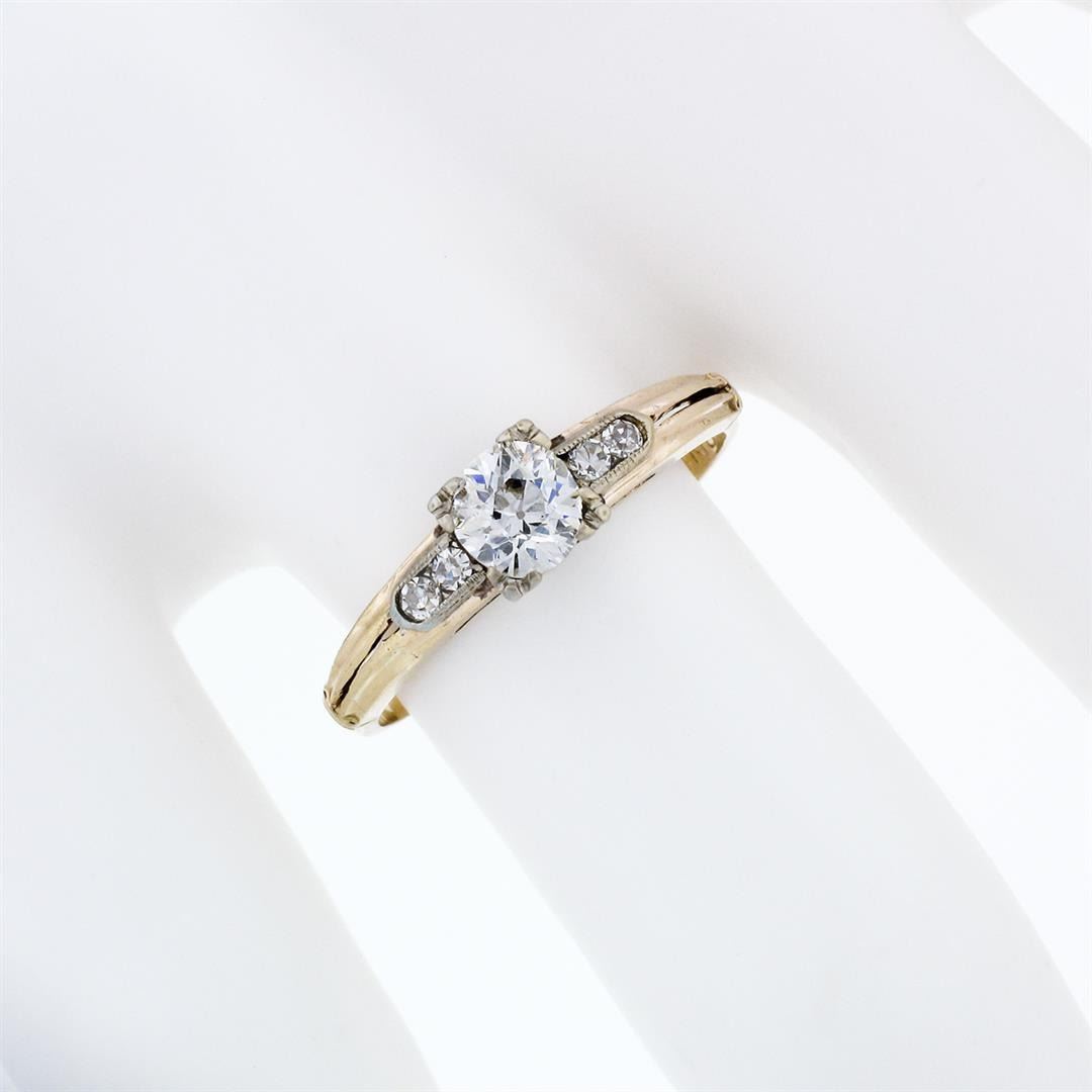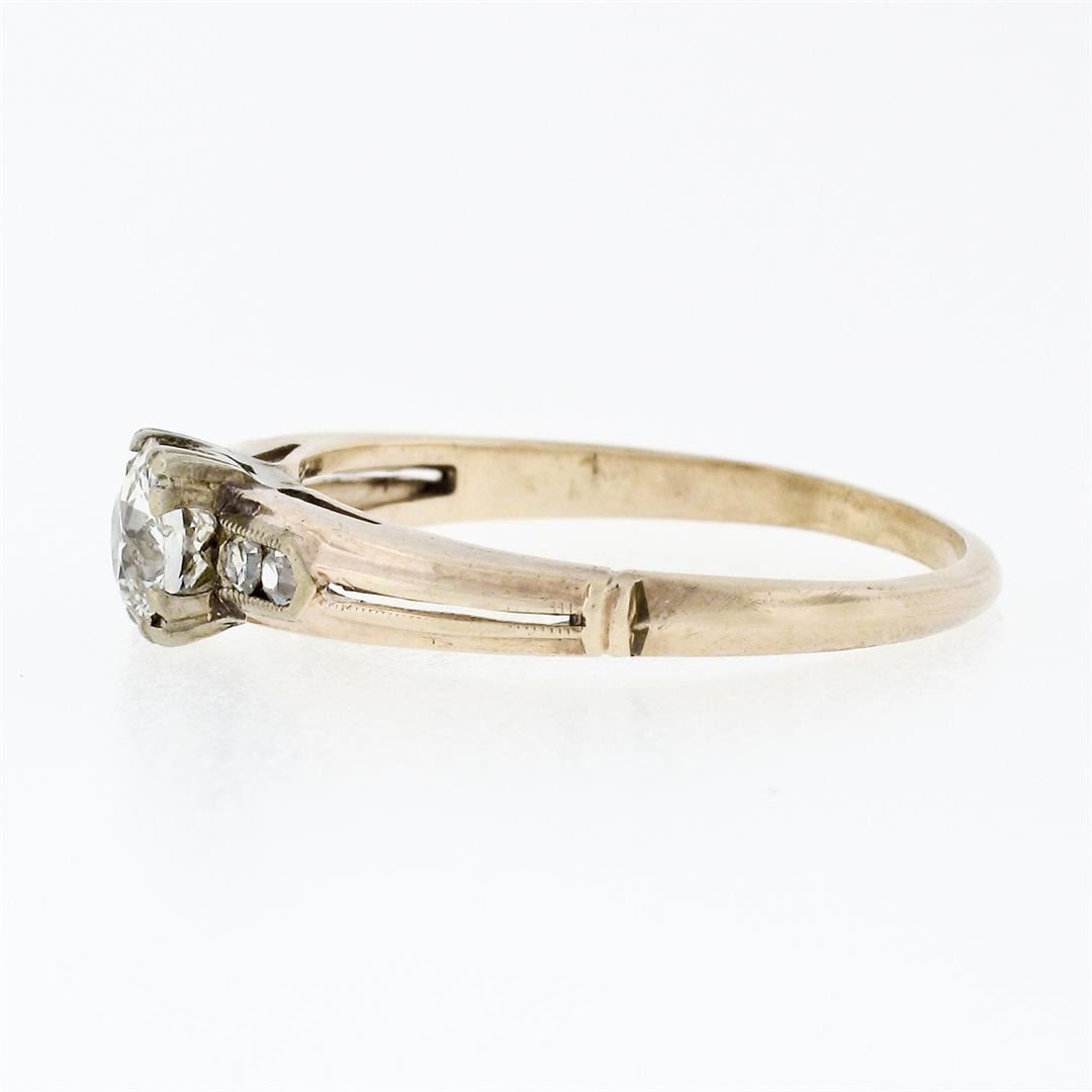 An antique solid 18k white gold & 14k yellow gold solitaire ring, featuring 1 old european cut natrual diamond (G - VS2; 0.42ct), and 4 old single cut natural diamonds (F/G - VS1/VS2 ; 0.08ctw). The ring is size 6, weighs a total of 1.65 grams, and measures 4.90mm wide.