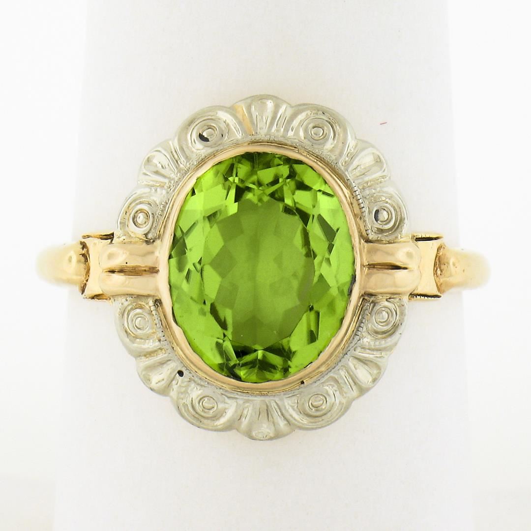 An antique solid 18k yellow & white gold solitaire ring, with 1 oval cut natural peridot ( 2.75ct). The ring is size 8.5, weighs a total of 3.54 grams, and measures 15.4mm wide.