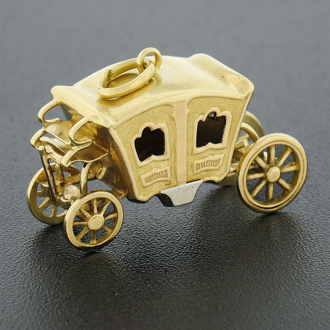 An antique solid 18k yellow gold coach carriage charm pendant. The pendant weighs a total of 4.89 grams, measures 21.90mx25.45mm including the bail, and the inside of the bail measures 3.0x5.0mm.