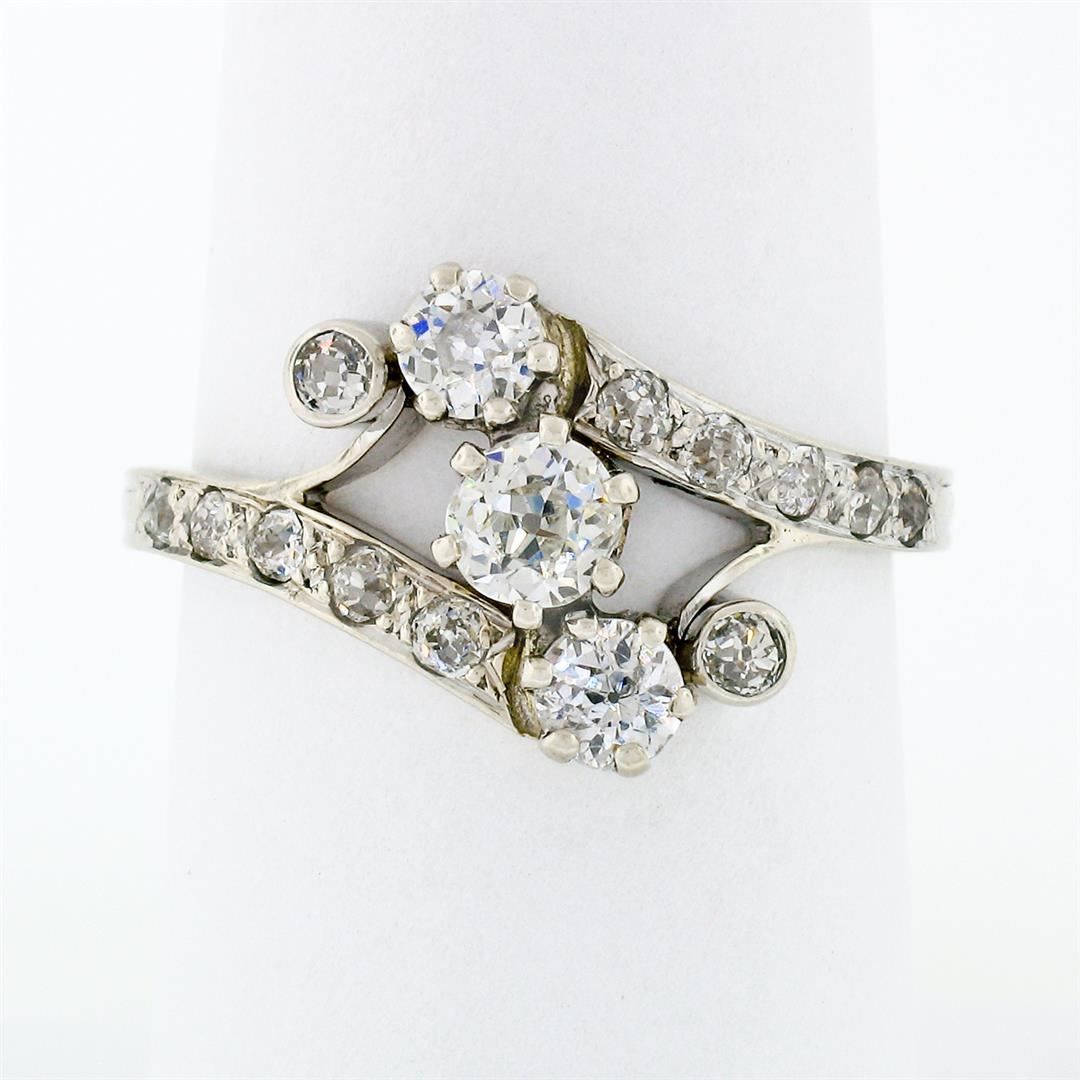 An antique solid 18k white gold bypass ring, with 3 old european cut natural diamonds (G/H - VS2-SI2 ; 0.75ctw), and 12 old european and mine cut natural diamonds (G-I - VS1-SI1; 0.36ctw ). The ring is size 8, weighs a total of 3.80 grams, and measures 12.25mm wide.