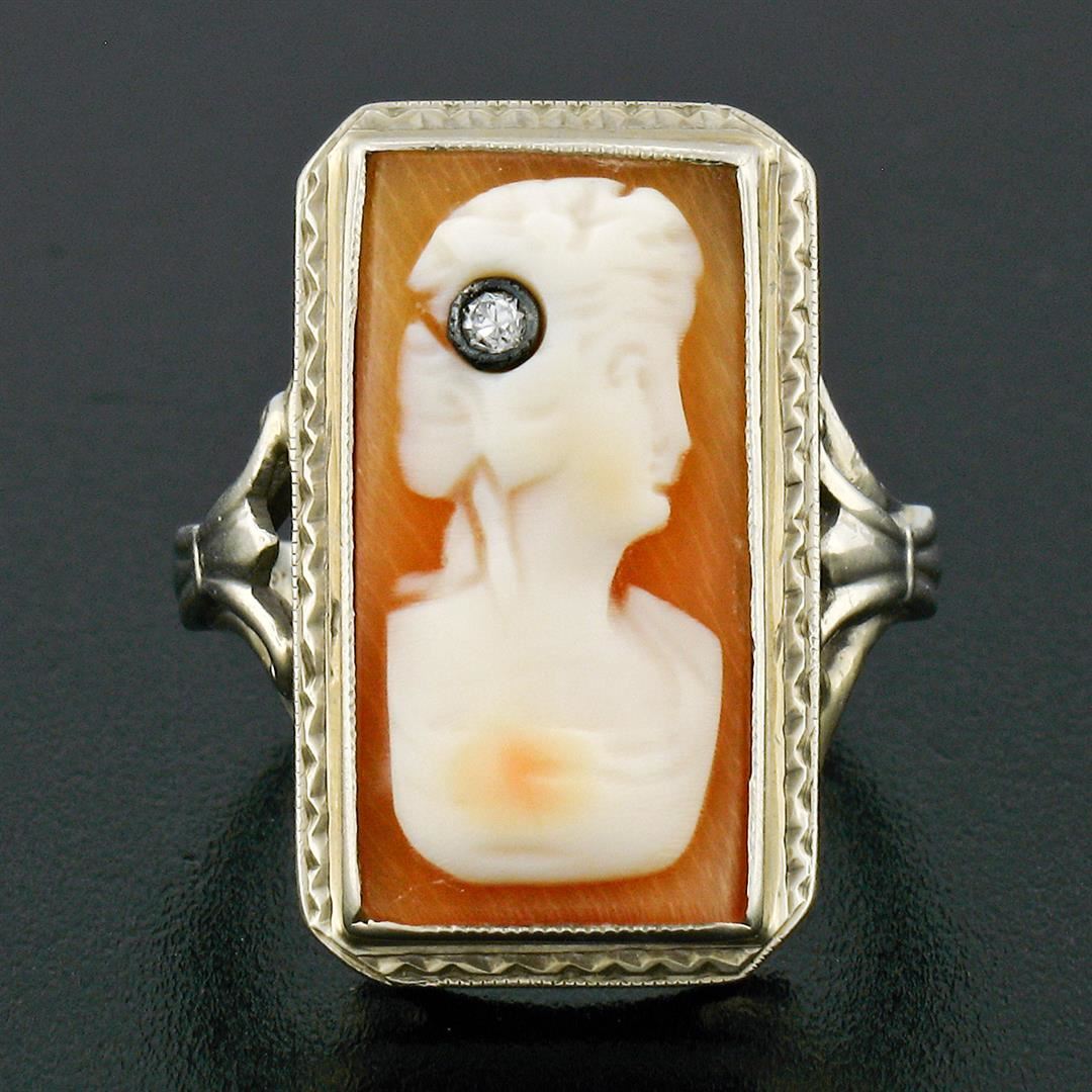 An antique solid 18k white gold ring, with 1 carved cameo shell (17.85x8.90mm), and 1 old single cut natural diamond (H - VS2 ; 0.01ct). The ring is size 4.5, weighs a total of 4.80 grams, and measures 20.80mm wide.