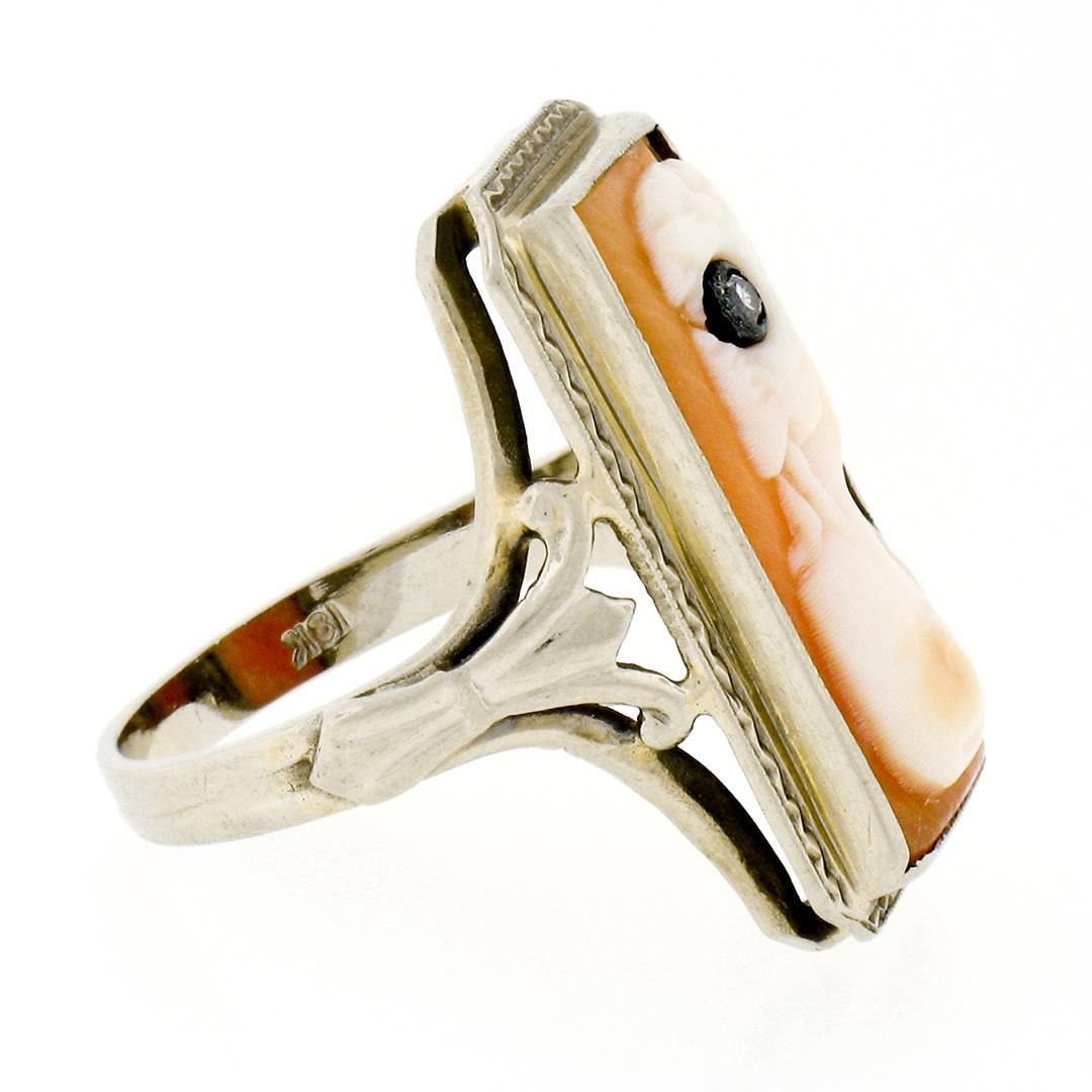 Antique 18K White Gold Rectangular Carved Shell Cameo Diamond Etched Frame Ring