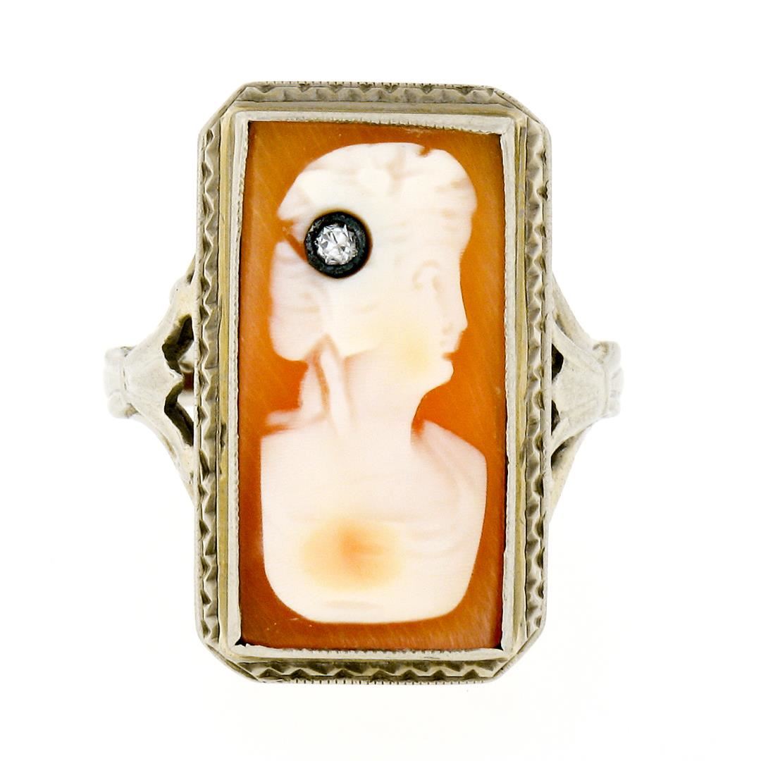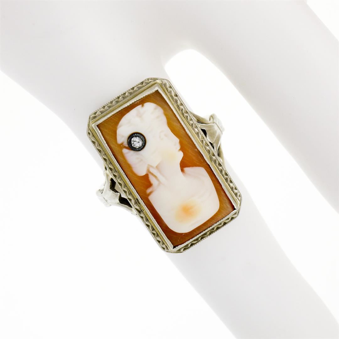 An antique solid 18k white gold ring, with 1 carved cameo shell (17.85x8.90mm), and 1 old single cut natural diamond (H - VS2 ; 0.01ct). The ring is size 4.5, weighs a total of 4.80 grams, and measures 20.80mm wide.