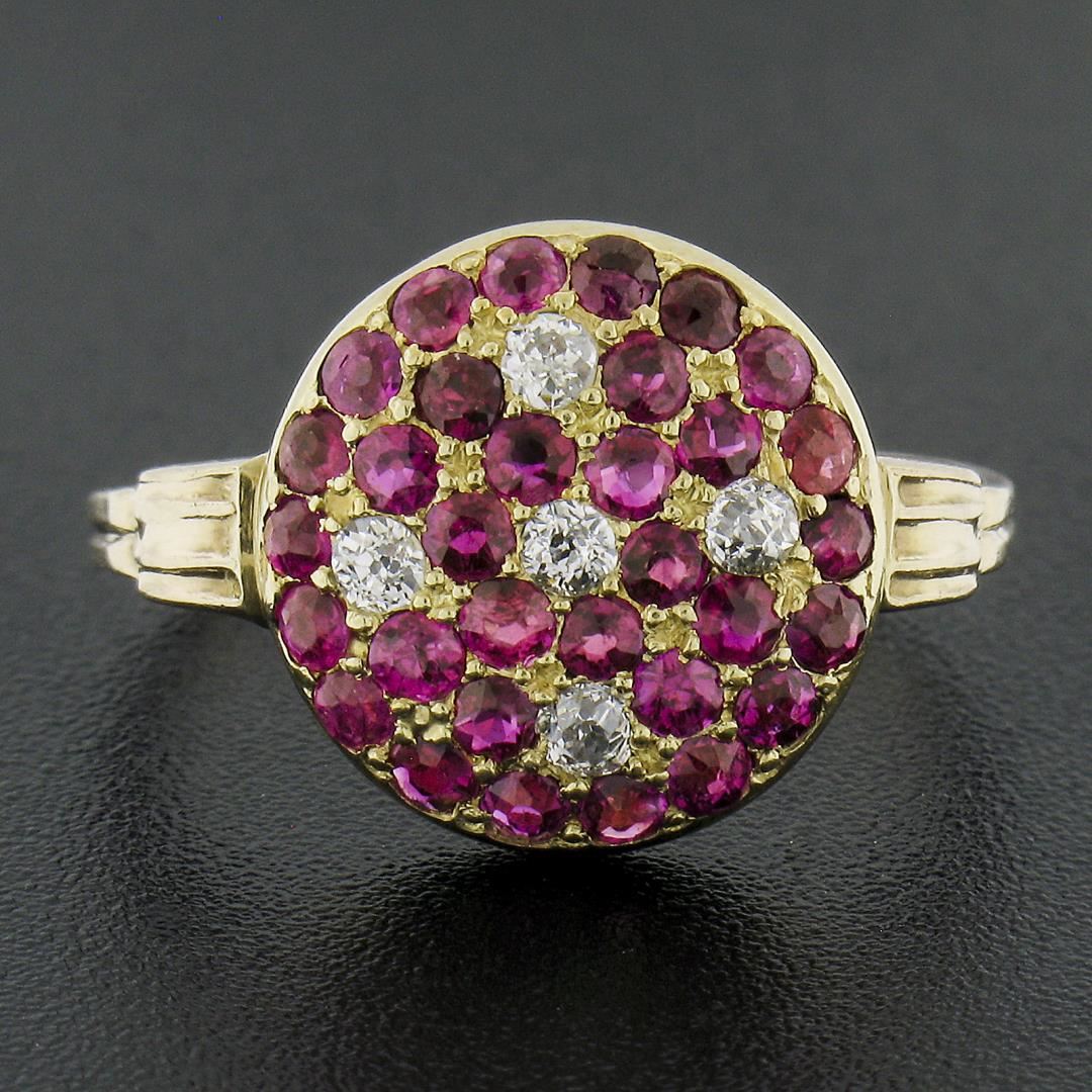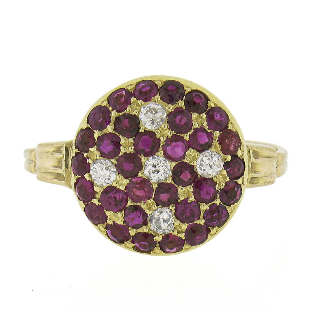 Antique 18K Yellow Gold 1.06ctw Old Cut Pave Set Ruby & Diamond Platter Ring