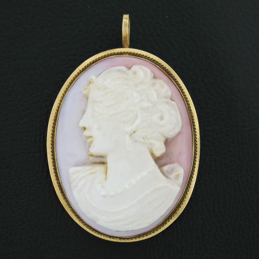 An antique solid 18k yellow gold brooch pendant, with 1 oval shape carved natural cameo coral (29.65x23.0mm). Measures 32.50x25.70mm and weighs a total of 7.65 grams.