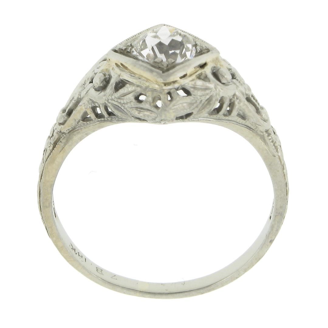 An antique solid 18k white gold engagement ring, with 1 old mine cushion cut natural diamond (G/H - VS2 ; 0.60ct). The ring is size 5.5, weighs a total of 2.63 grams, and measures 11.6mm wide.