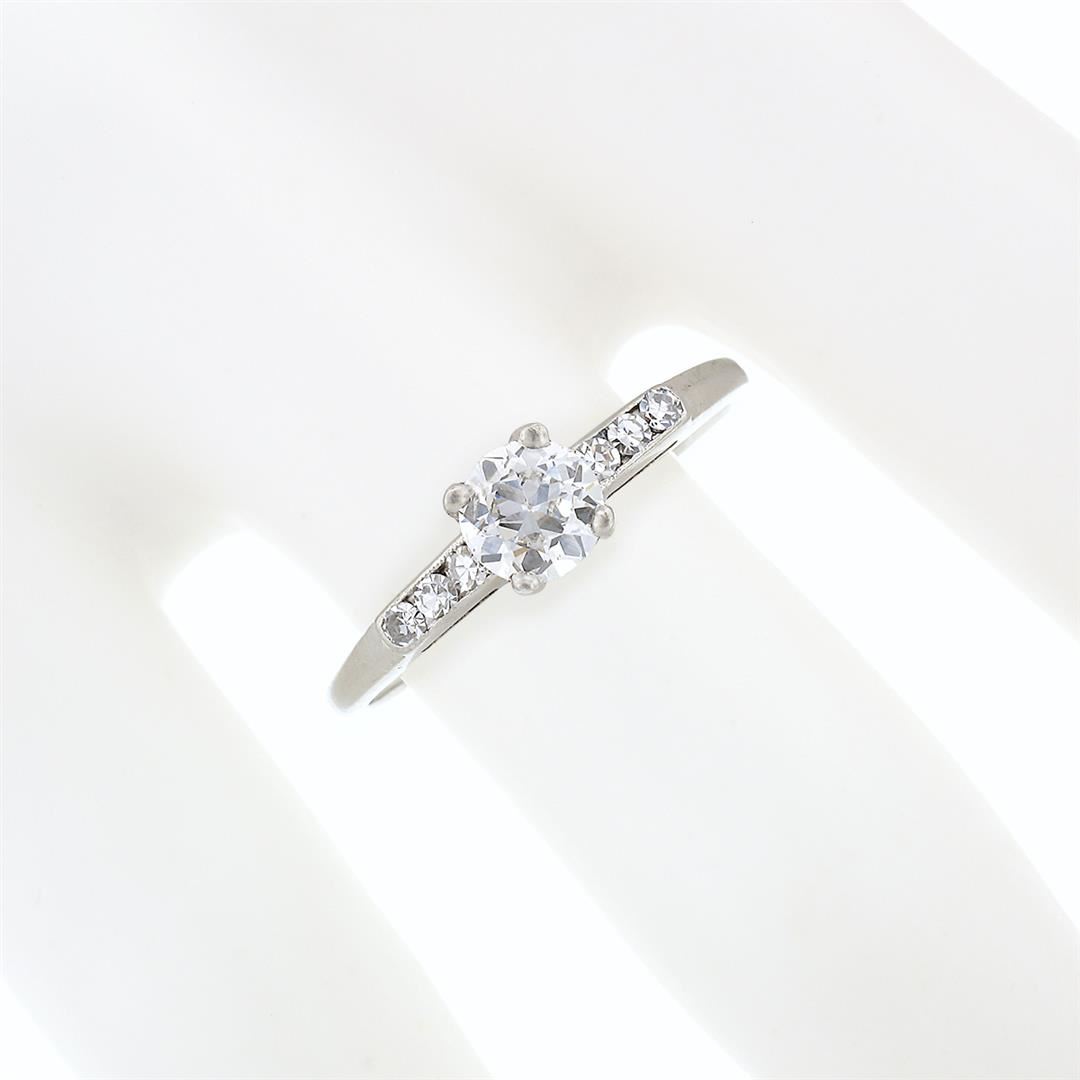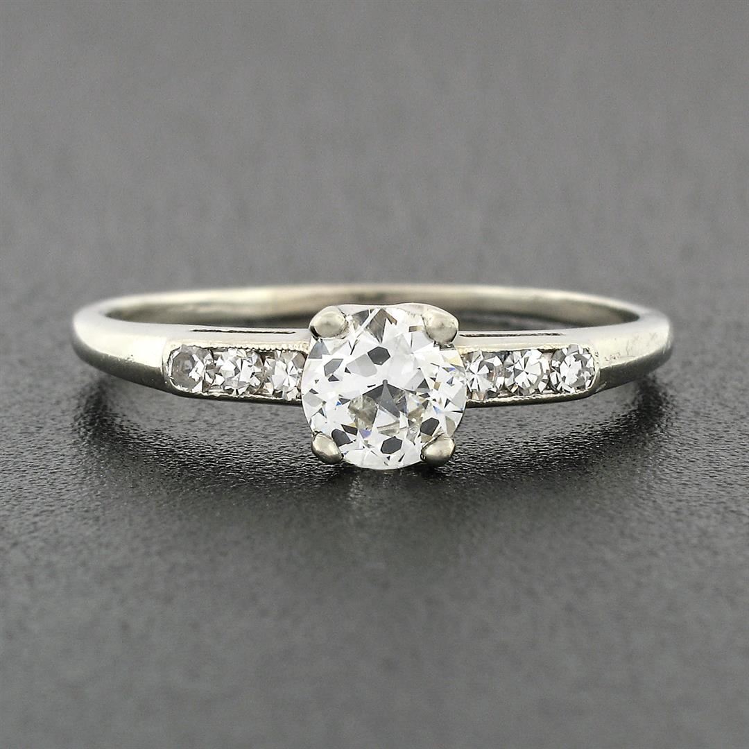 An antique solid 18k white gold engagement ring, with 1 old european cut natural diamond (H - SI1 ; 0.60ct ), and 6 old single cut natural diamonds (G/H - VS1/VS2 ; 0.12ctw ). The ring is size 9.0, weighs a total of 2.38 grams, and measures 5.4mm wide.
