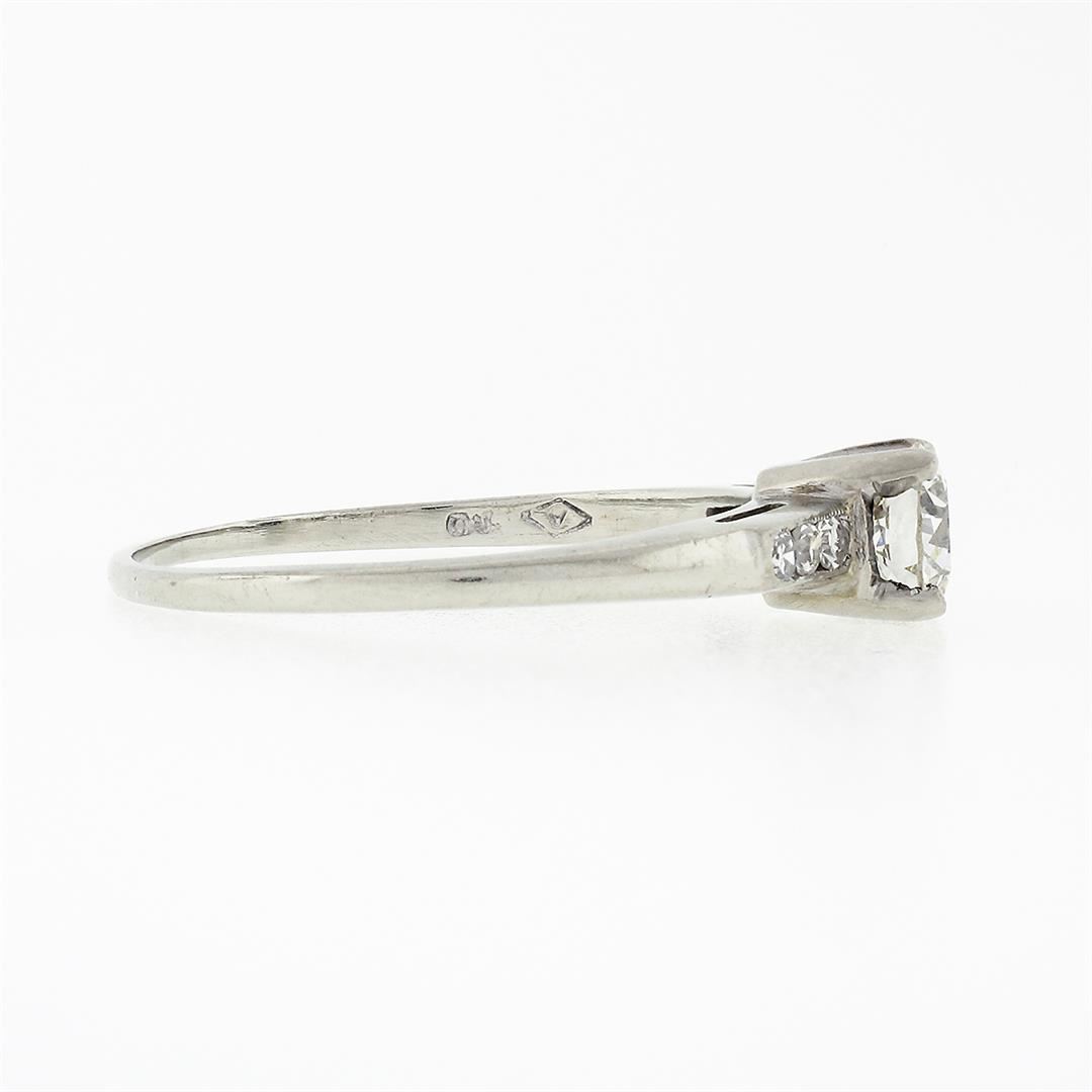 An antique solid 18k white gold engagement ring, with 1 old european cut natural diamond (H - SI1 ; 0.60ct ), and 6 old single cut natural diamonds (G/H - VS1/VS2 ; 0.12ctw ). The ring is size 9.0, weighs a total of 2.38 grams, and measures 5.4mm wide.