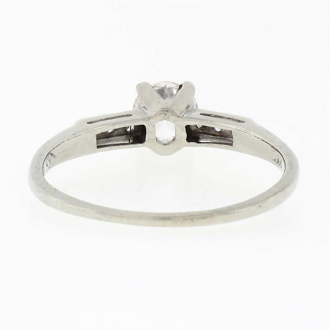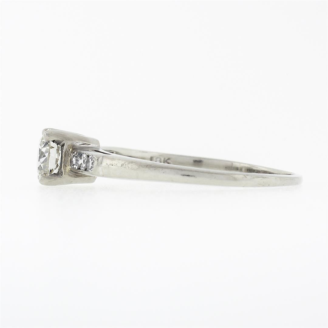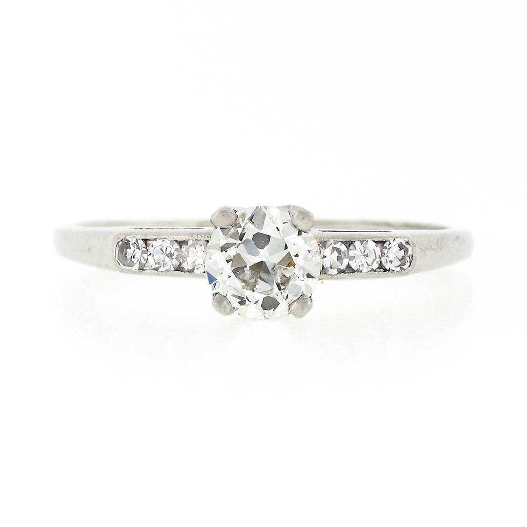 An antique solid 18k white gold engagement ring, with 1 old european cut natural diamond (H - SI1 ; 0.60ct ), and 6 old single cut natural diamonds (G/H - VS1/VS2 ; 0.12ctw ). The ring is size 9.0, weighs a total of 2.38 grams, and measures 5.4mm wide.