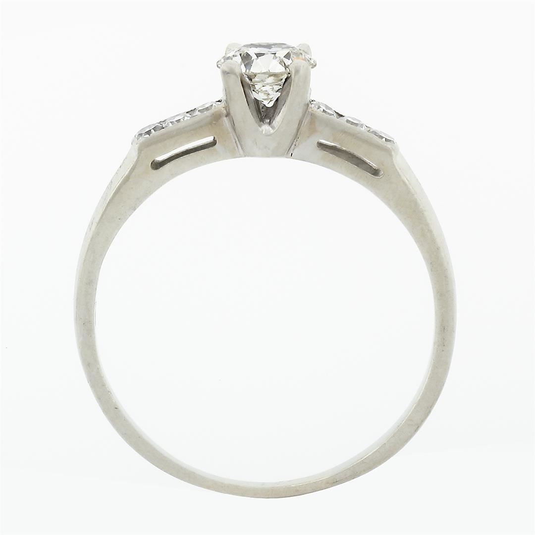 An antique solid 18k white gold engagement ring, with 1 old european cut natural diamond (H - SI1 ; 0.60ct ), and 6 old single cut natural diamonds (G/H - VS1/VS2 ; 0.12ctw ). The ring is size 9.0, weighs a total of 2.38 grams, and measures 5.4mm wide.