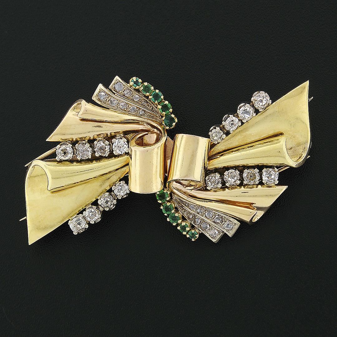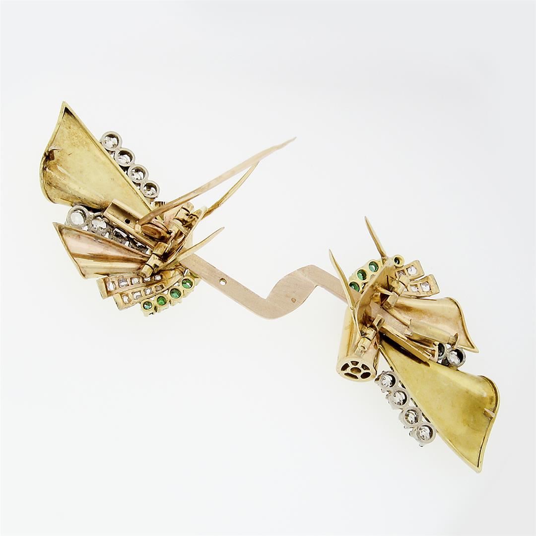 An antique solid 18k rosy yellow, green & white gold dual dree clip brooch, with 16 old mine cut natural diamonds (G -J - VS2-SI2 ; 2.02ctw), and 18 round rose cut natural diamonds (G-I - VS2- I1 ; 0.72ctw ), & 10 round cut natural emeralds (0.50ctw). Measures 39.57x63.38mmm and weighs a total of 32.83 grams.