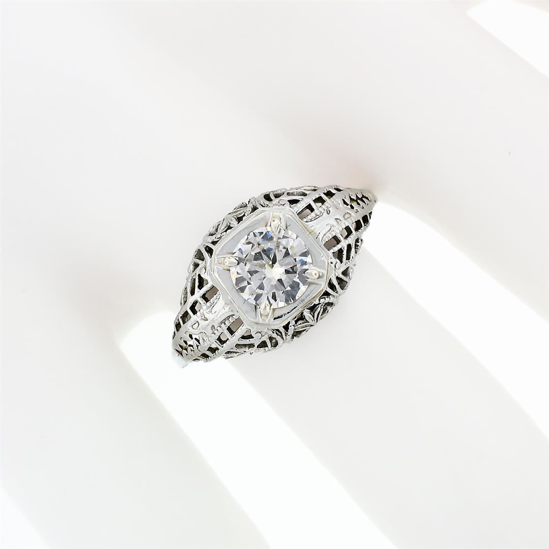 An art deco solid 18k white gold filigree engagement ring, with 1 GIA Certified old transitional cut natural diamond (I - VS2 ; 0.71ct). The ring is size 7.5, weighs a total of 2.23 grams, and measures 10.5mm wide. Comes with all original relevant certifi