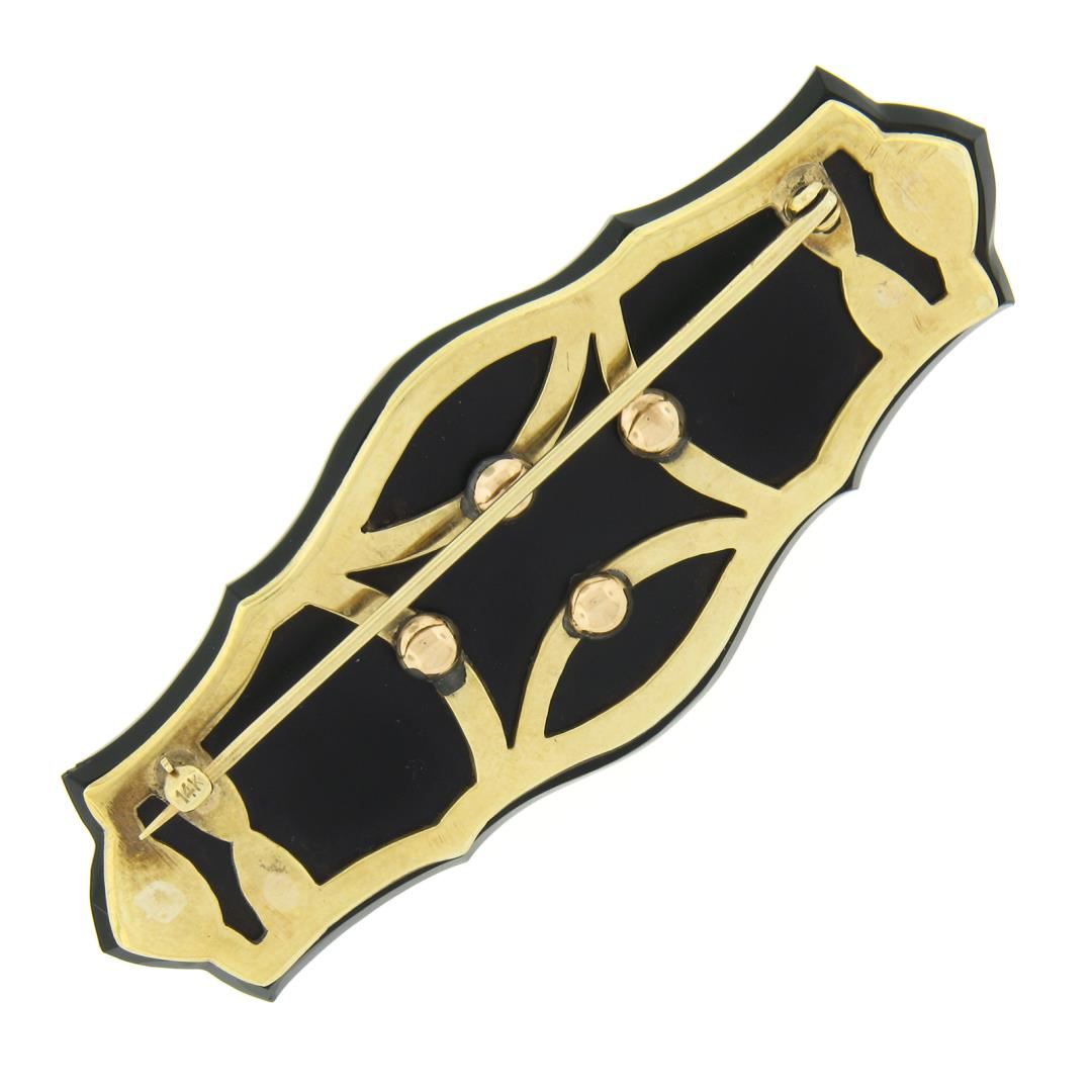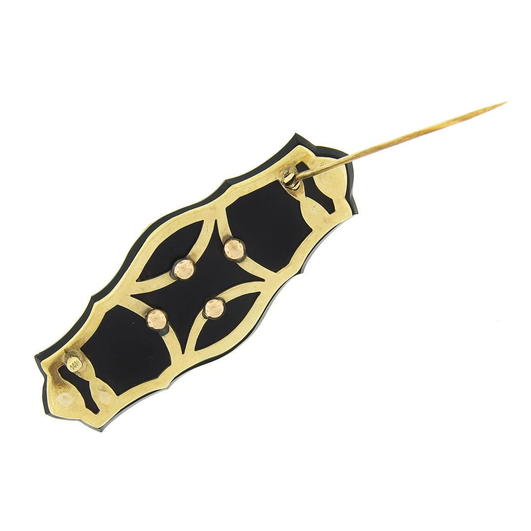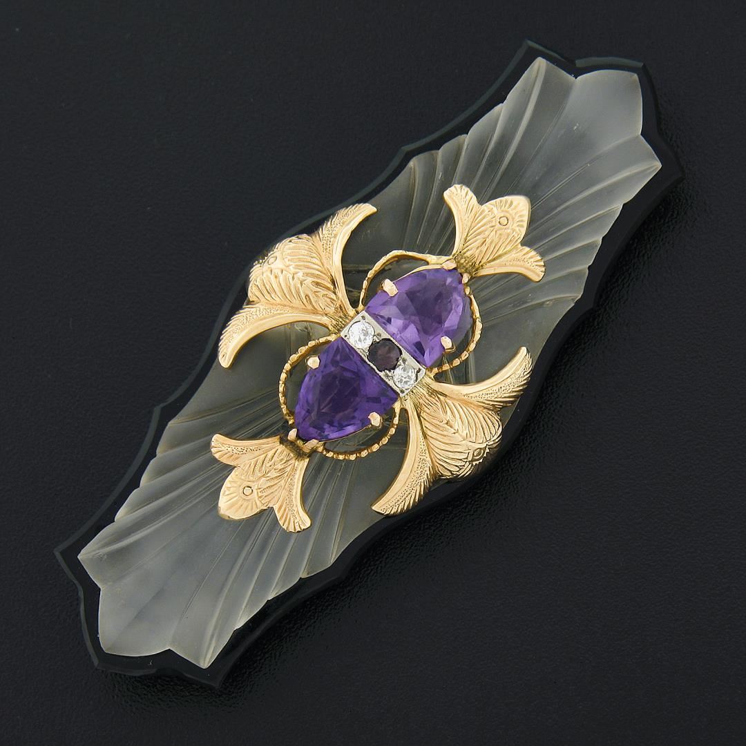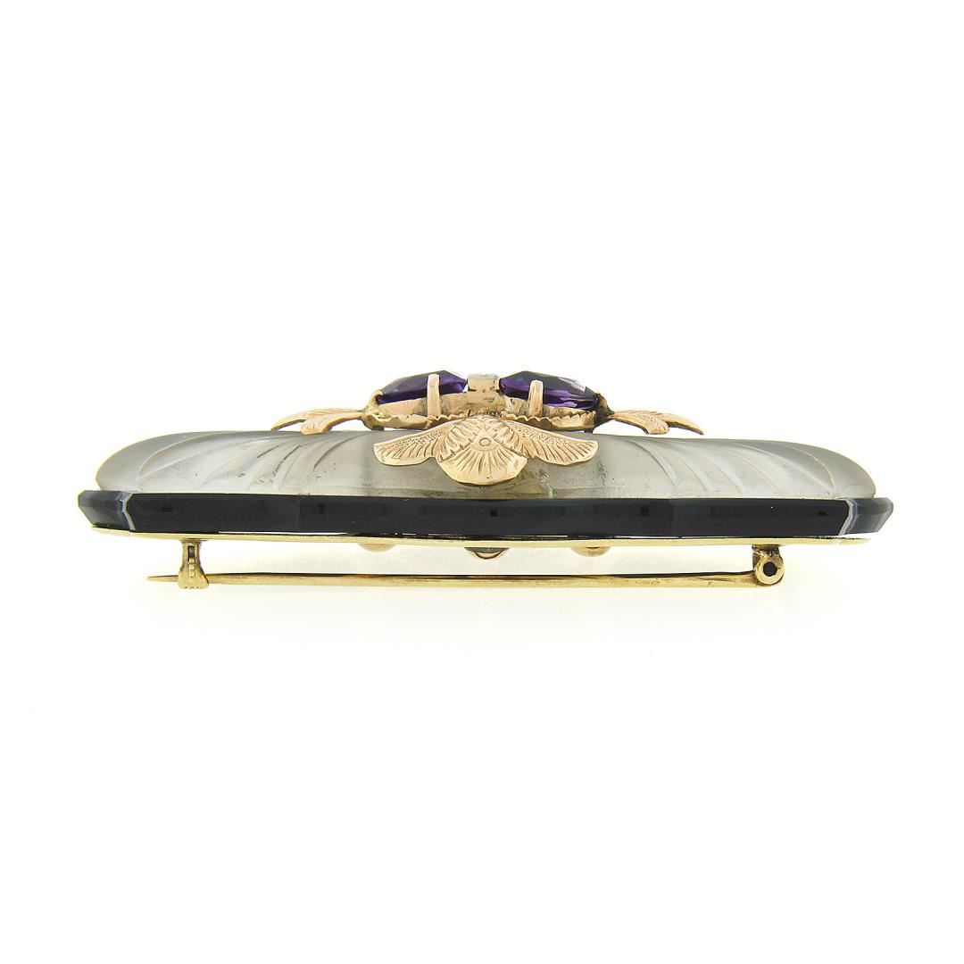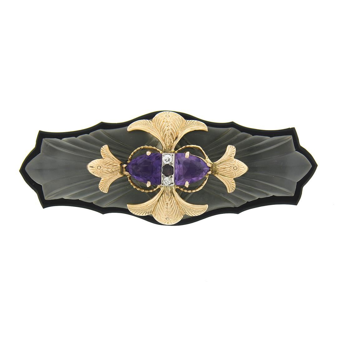 An antique solid 18k rose & yellow gold carved camphor glass brooch, with black onyx, 2 old european cut natural diamonds (G/H - VS2/SI1 ; 0.05ctw), and 3 round and custom cut natrual amethyst (3ctw ). Measures 26.6x68.3mm and weighs a total of 28.17 grams.