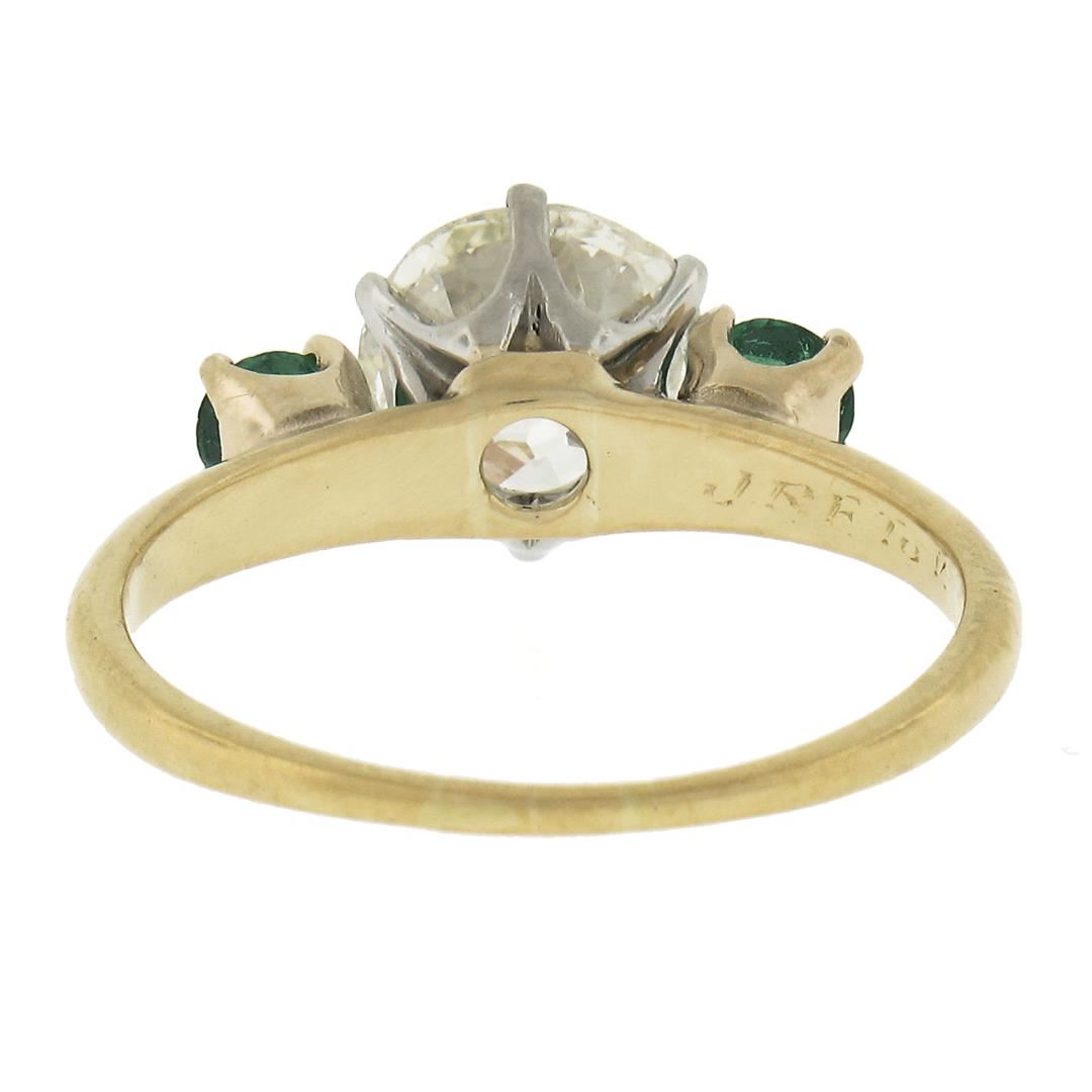Antique 18k Gold & Platinum 2.02ct GIA European Diamond w/ Emerald 3 Stone Ring