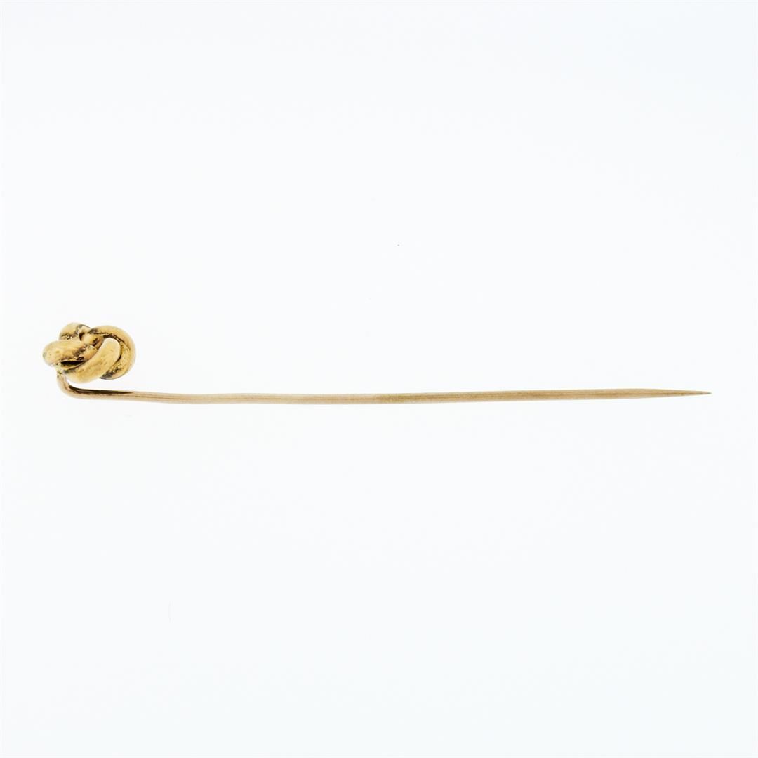 An antique solid 18k yellow gold knot stick pin. Measures 64.30x8.85mm and weighs a total of 1.23 grams.