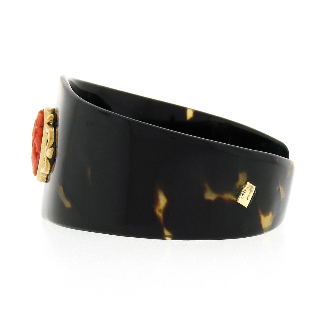 A antique solid 18k yellow gold open cuff bracelet, with black stone and 1 carved natural coral (14x10mm). It weighs a total of 8.86 grams, measures 28.50mm wide, and measures 6.25 inches in length.