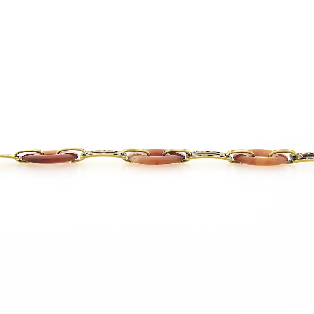 An antique solid 14k yellow gold link bracelet, with 3 pierced round cabochon cut natural agate (24.5mm, 25mm & 26mm) & enamel work. It weighs a total of 26.26 grams, measures 25mm wide, and measures 6.5 inches in length.