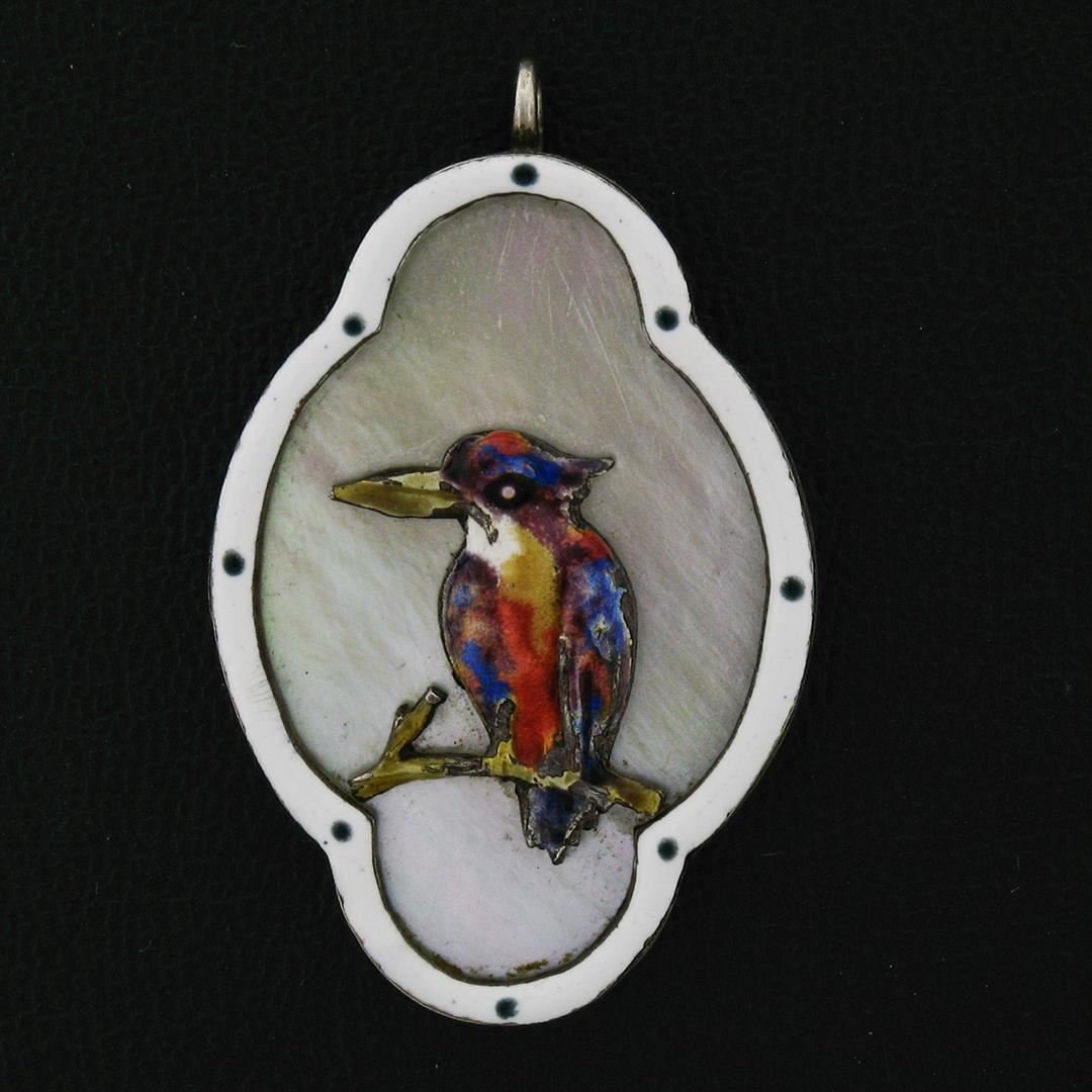 An antique solid sterling silver and enamel pendant, with 1 elongated quatrefoil shape natural mother of pearl (34.9x22.4mm). The pendant weighs a total of 8.4 grams, measures 42.67x26.75mm including the bail, and the inside of the bail measures 1.65x1.65mm.