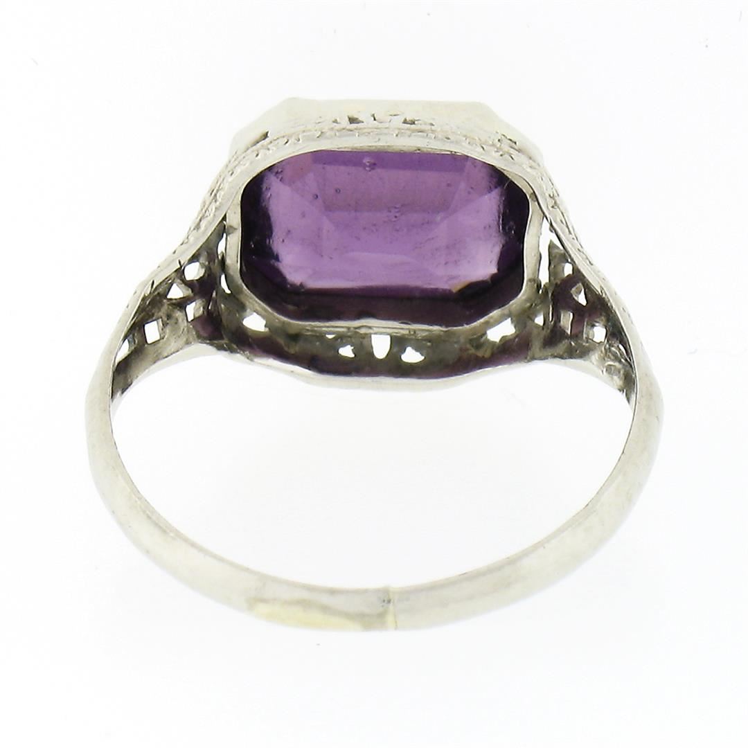 An antique art deco solid 10k white gold solitaire ring, with 1 custom cut natural amethyst (7.4x5.7mm). The ring is size 3.0, weighs a total of 1.18 grams, and measures 9.1mm wide.