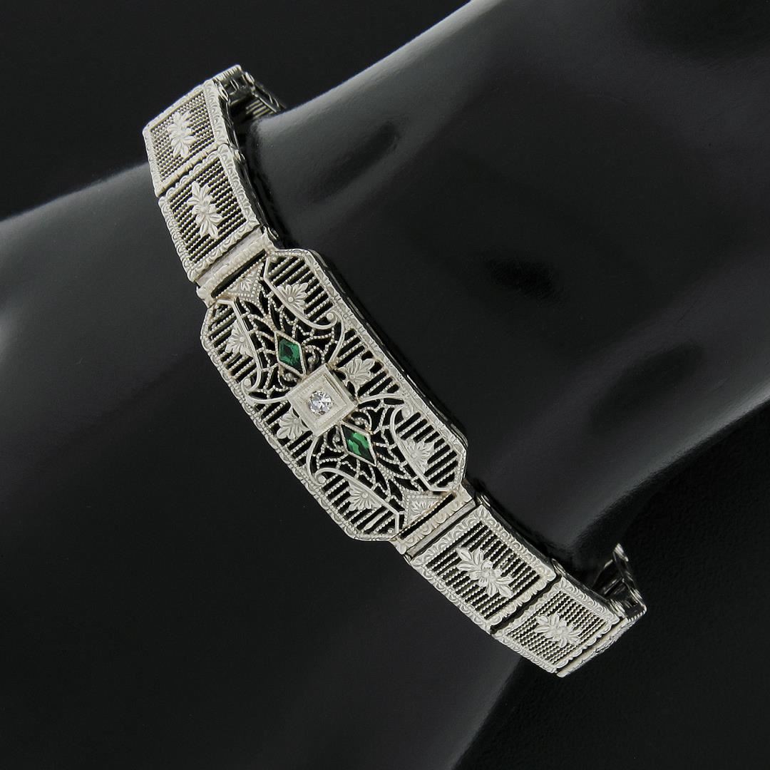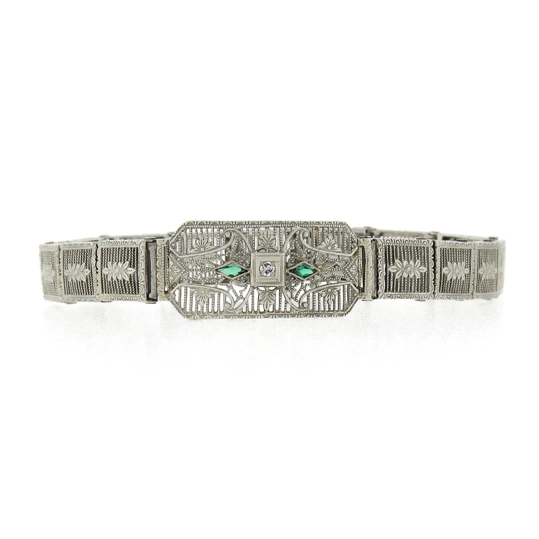 An antique solid 10k white gold filigree bracelet, with 1 old single cut natural diamond (G - VS2 ; 0.02ct ), and 2 kite cut synthetic emeralds. It weighs a total of 10.77 grams, measures 12.8mm wide, and measures 6.5 inches in length.