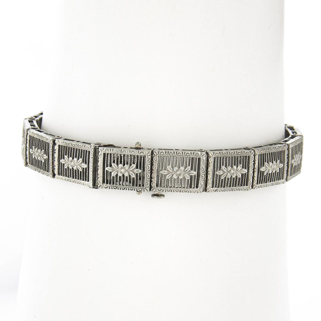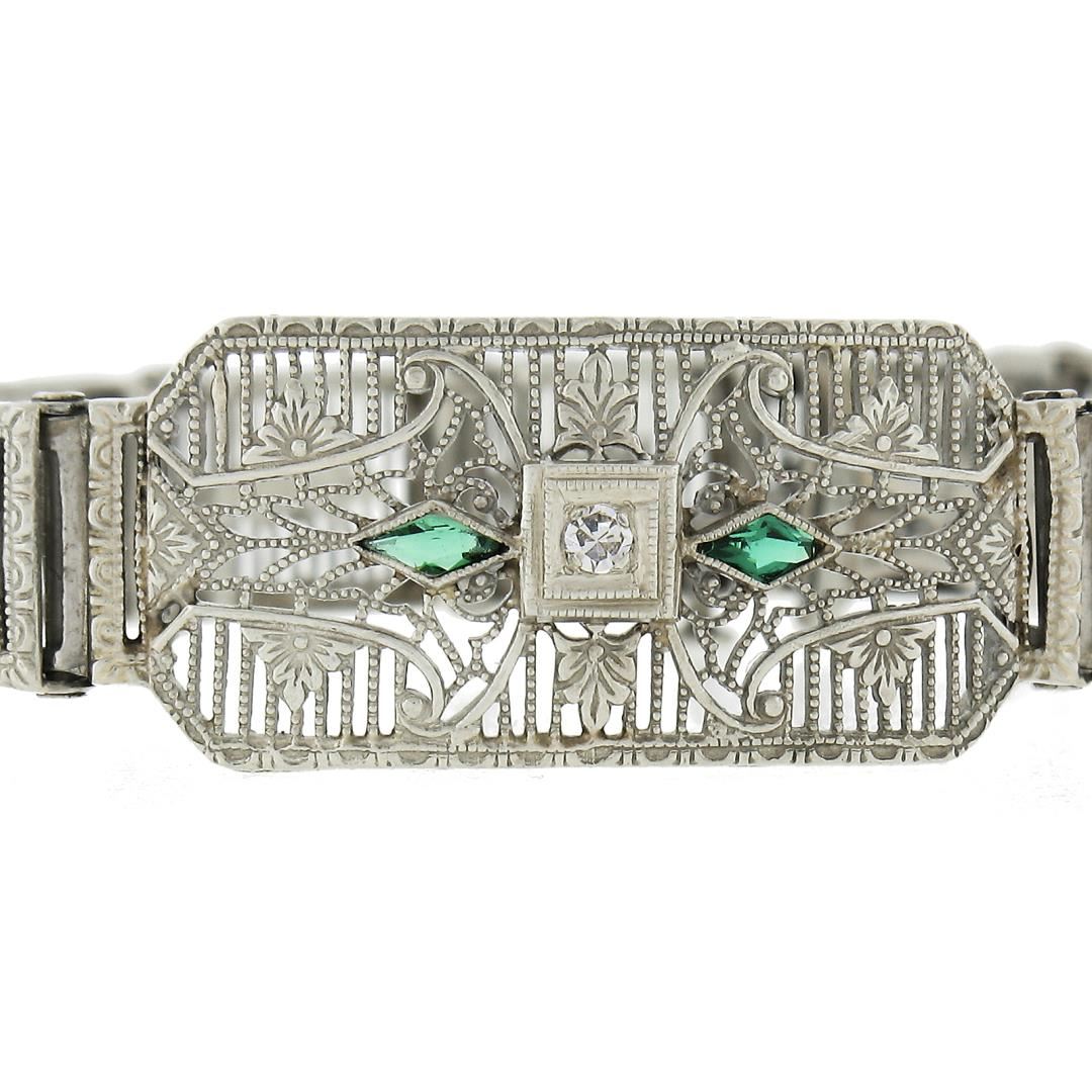 An antique solid 10k white gold filigree bracelet, with 1 old single cut natural diamond (G - VS2 ; 0.02ct ), and 2 kite cut synthetic emeralds. It weighs a total of 10.77 grams, measures 12.8mm wide, and measures 6.5 inches in length.