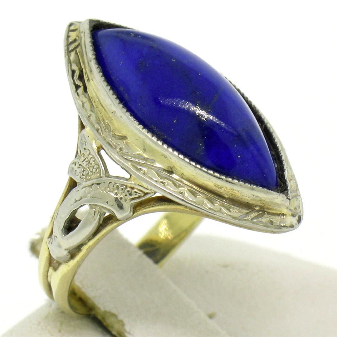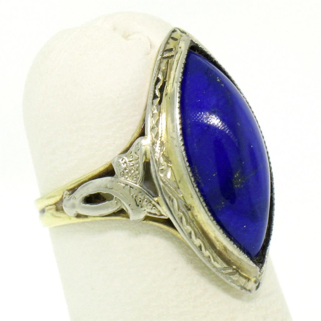 An antique art deco solid 10k white gold cocktail ring, with 1 marquise cabochon cut natural lapis lazuli (16.50x8.60mm). The ring is size 4.5, weighs a total of 3.50 grams, and measures 21.0mm wide.