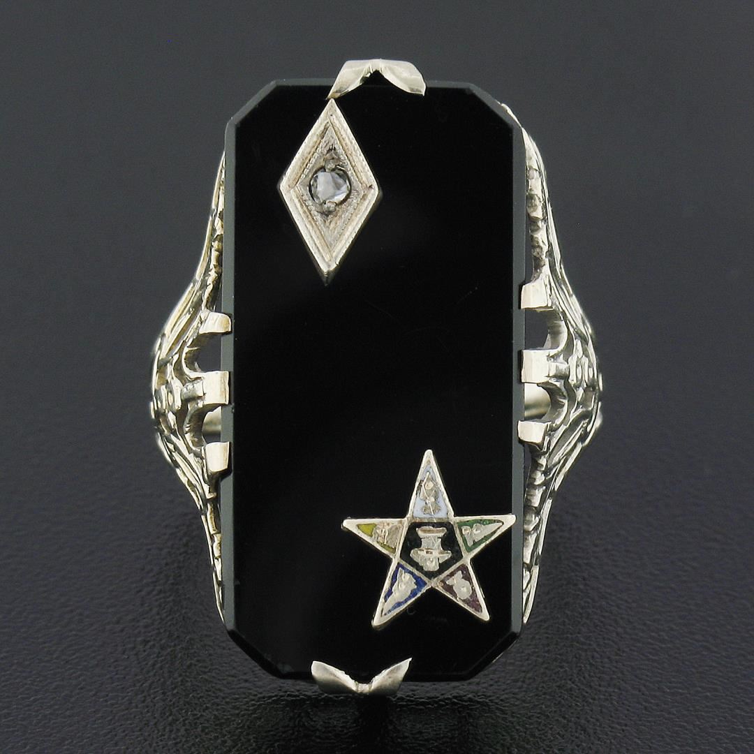 an antique solid 14k white gold ring, with 1 rectangular cut black onyx (22.1x11.3mm), and 1 old round cut natural diamond ( J - SI2 ; 0.02ct). The ring is size 4.0, weighs a total of 3.74 grams, and measures 23.4mm wide.