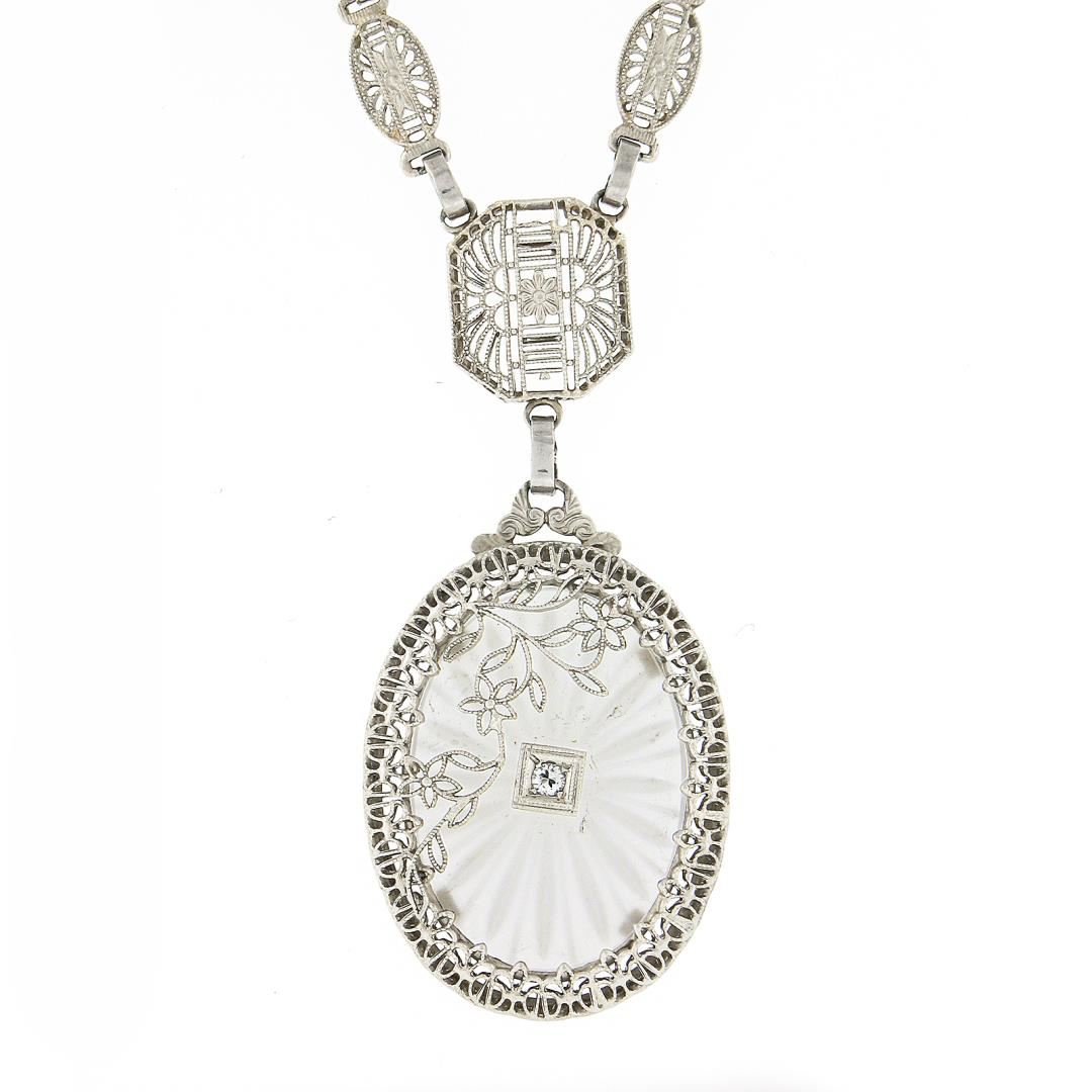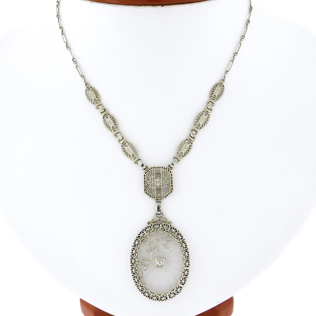 an antique solid 14k white gold dangle pendant necklace. with oval camphor glass & 1 old transitional cut natural diamond ( F - VS1 ; 0.04ct). 14 inch open filigree link chain, 9.54 grams total weight, pendant dangle measures 53.70x24mm.